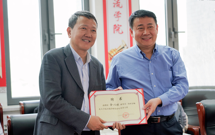 座谈会上,唐洲雁和金以林共同为山东师范大学抗日战争研究中心揭牌,聘请金以林为山东师范大学抗日战争研究中心名誉主任,唐洲雁为金以林颁发聘书。
