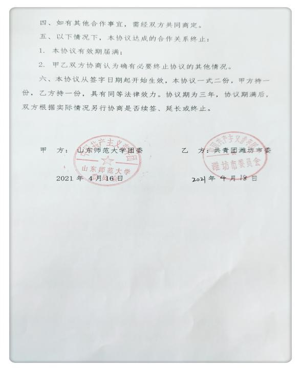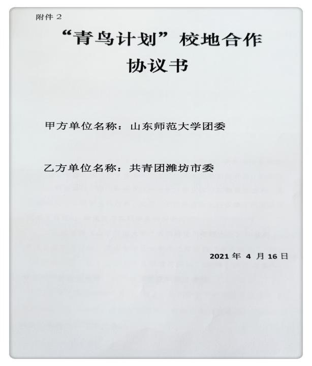 为全面落实共青团山东省委关于推进“青鸟计划”工作要求,进一步加强校地合作,近日山东师范大学团委与共青团潍坊市委签署“青鸟计划”校地合作协议,具体工作由历史文化学院负责执行。