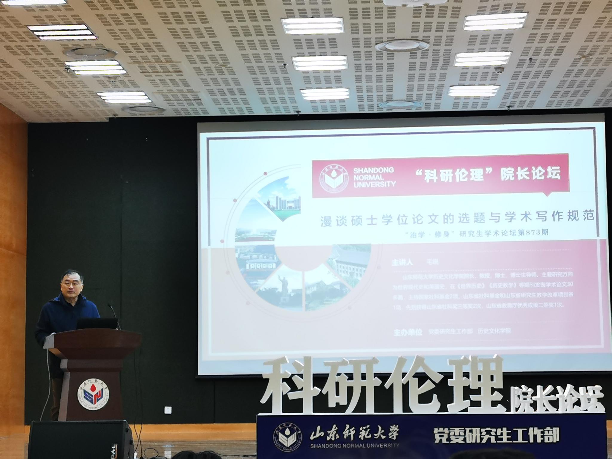 10月21日,由党委研究生工作部、历史文化学院联合主办的“科研伦理”院长论坛在长清湖校区图书馆报告厅成功举办。历史文化学院院长、博士生导师毛锐教授以“漫谈硕士学位论文的选题与学术写作规范”为题做了学术报告,本次讲座由院研究生辅导员林淑玉主持,学院各级研究生和高年级本科生参加了本次讲座。