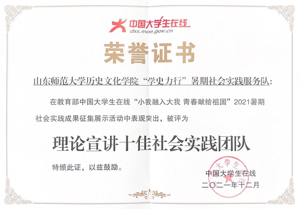 历史文化学院将以此番社会实践队获评理论宣讲十佳社会实践团队为契机,充分发挥“头雁效应”,不断组织学生积极参加社会实践,真正将理论学习与实践育人相结合,在为基层为社会办实事的广阔天地中有所作为!