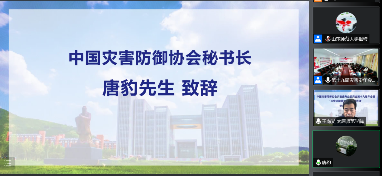 中国灾害防御协会秘书长唐豹先生,山西大学副校长郝平教授,中国人民大学历史学院院长、清史研究所所长朱浒教授分别致辞,均充分肯定了本次年会主题的重大历史与现实意义,充分肯定了灾害史在跨学科交流、多领域交流合作、推动国家防灾减灾事业方面所作出的努力和贡献,并对本次年会的主办方山东师范大学历史文化学院表示感谢。