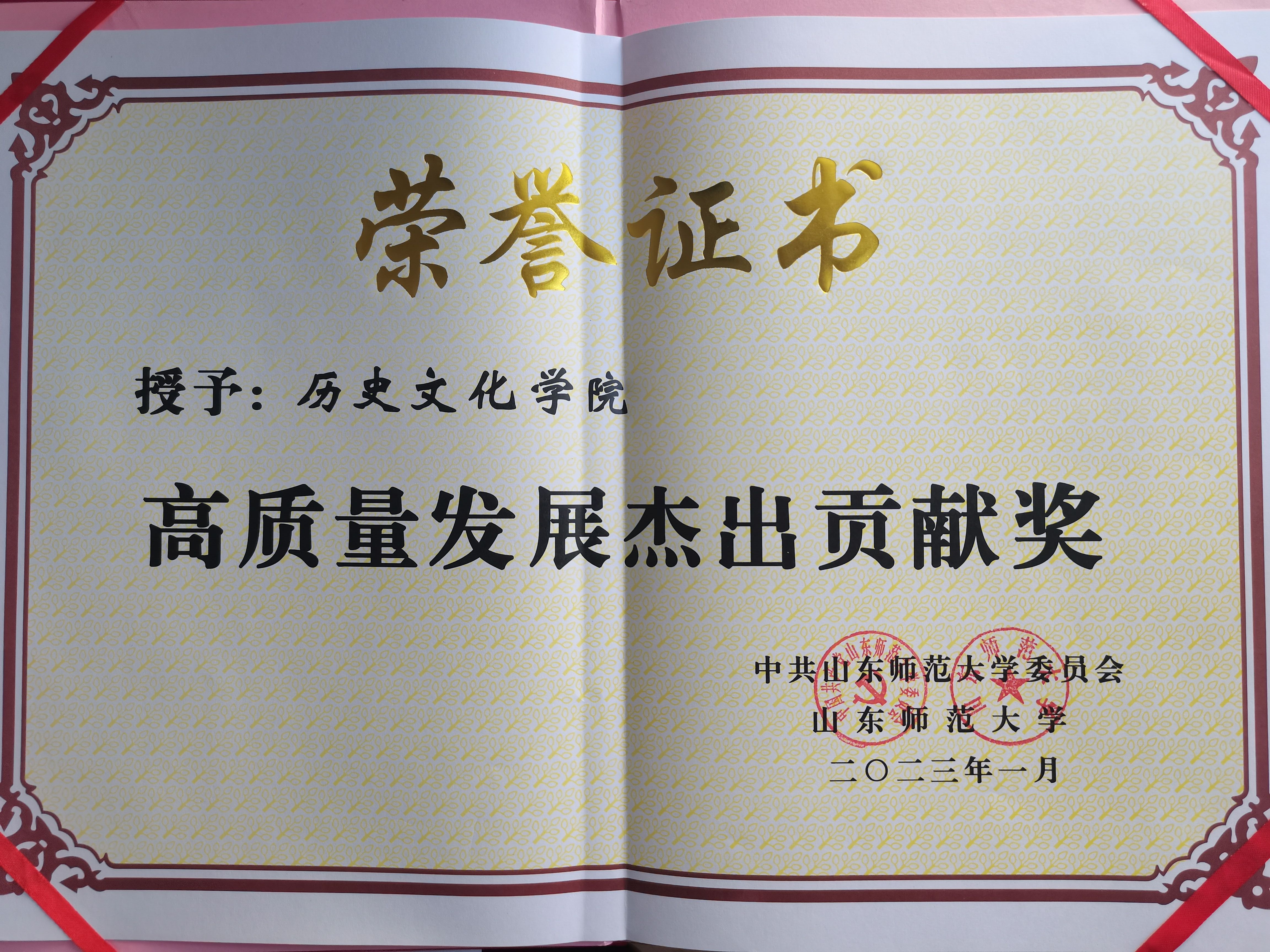 表彰大会上,冯继康书记为历史文化学院颁发山东师范大学高质量发展“杰出贡献奖”,这是本次表彰会的最高奖项。学院同时获评山东师范大学疫情防控工作优秀单位。