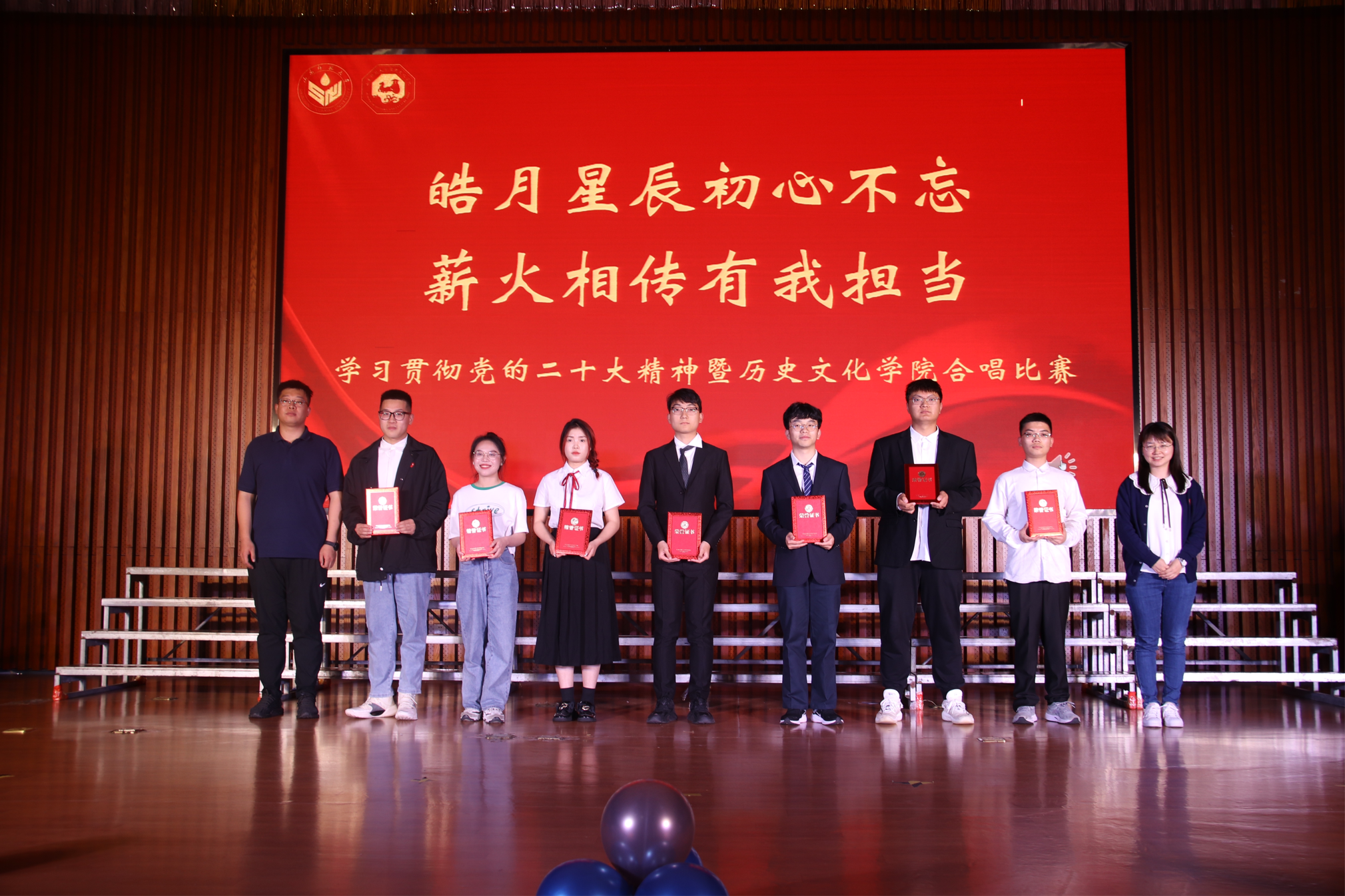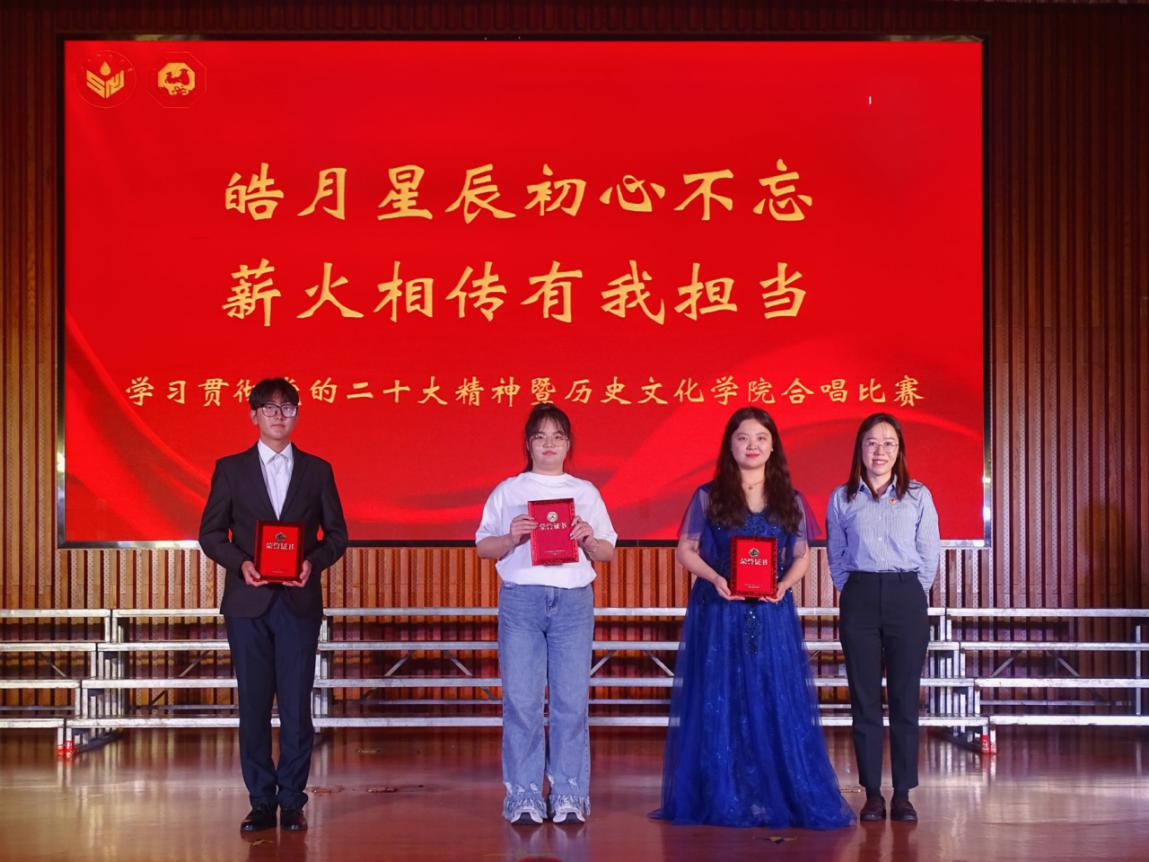 为学习贯彻党的二十大精神,激发同学们爱党爱国热情,5月4日晚,“皓月星辰初心不忘,薪火相传有我担当”学习贯彻党的二十大精神暨历史文化学院合唱比赛在文昌楼105报告厅举行。历史文化学院党委书记刘新生,党委副书记鲁法军、学生工作办公室主任、团委书记魏宁、学院辅导员郭慧颖、衣晓杰、刘畅、蒋艺出席,与2021级、2022级三百余名本科生共同观看了本场比赛。各学院文体部部长担任大赛的评委。