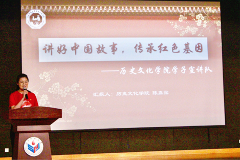 本次比赛从四月中旬开始,分为初赛和决赛两轮比赛。决赛环节室内、室外两大会场同时进行,室内会场由前期初赛入围复赛的16个学院参加,要求学生代表向评委老师进行5分钟的项目展示和3分钟的项目答辩。我院学子宣讲队长陈嘉露同学上台做展示汇报,从项目简介、创新举措、项目成效和未来展望四个方面全面介绍了历史文化学院学子宣讲队志愿服务项目,并出色完成了项目答辩,获得了评委一致好评。