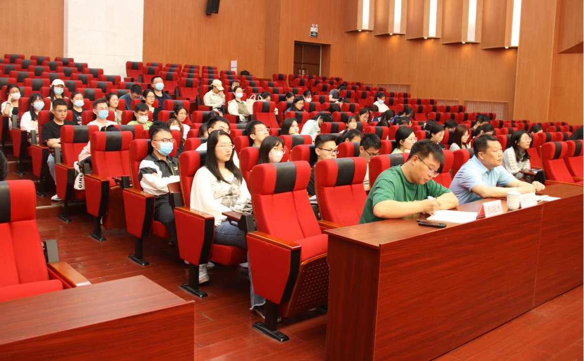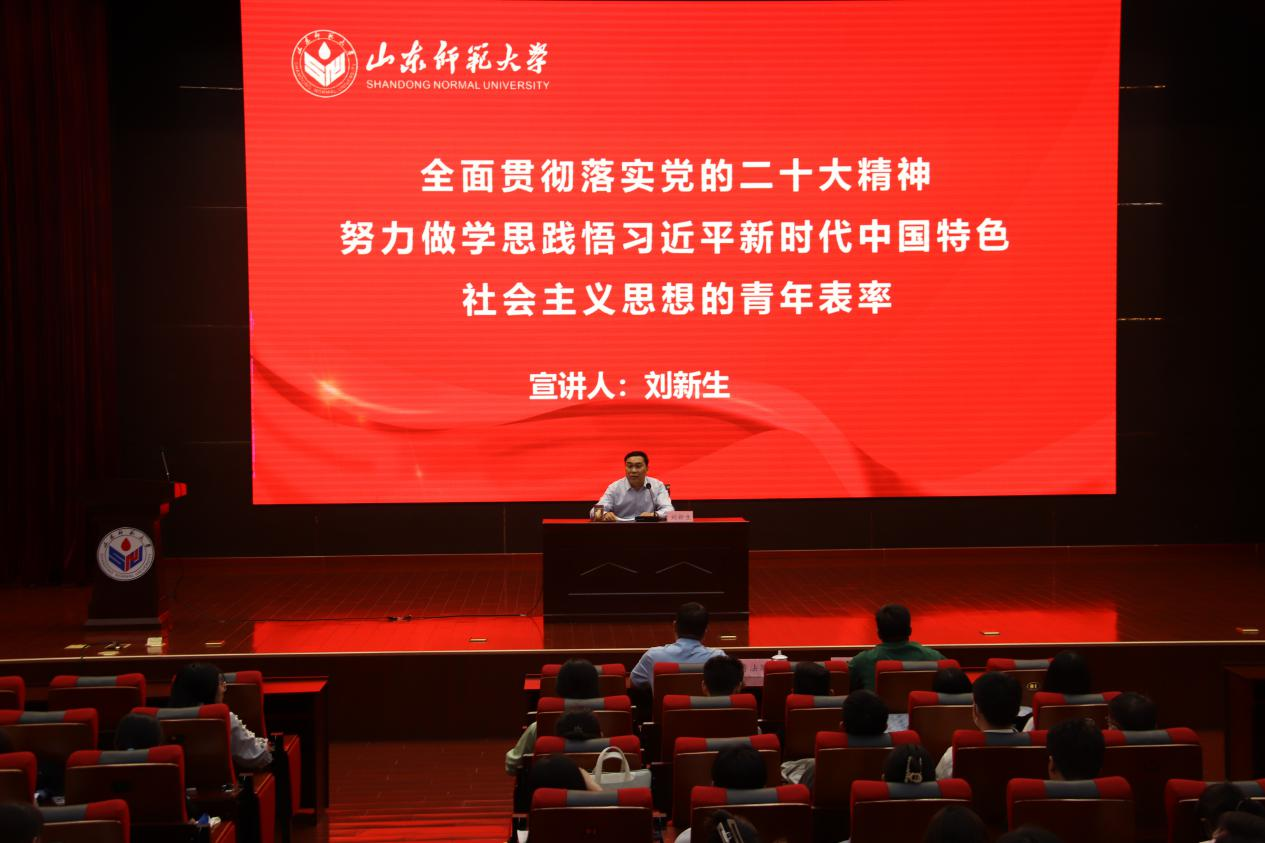 5月12日下午,为深入开展学习贯彻习近平新时代中国特色社会主义思想主题教育,不断增强党组织的政治和思想引领力,推动学院立德树人取得新成效,学院党委书记刘新生在山东师范大学长清湖校区树蕙堂第一报告厅讲授主题教育专题党课,做主题为“全面贯彻落实党的二十大精神,努力做学思践悟习近平新时代中国特色社会主义思想的青年表率”的报告。学院党委副书记鲁法军主持报告会,全体学生党员、党员发展对象和部分教师100余人聆听了报告。