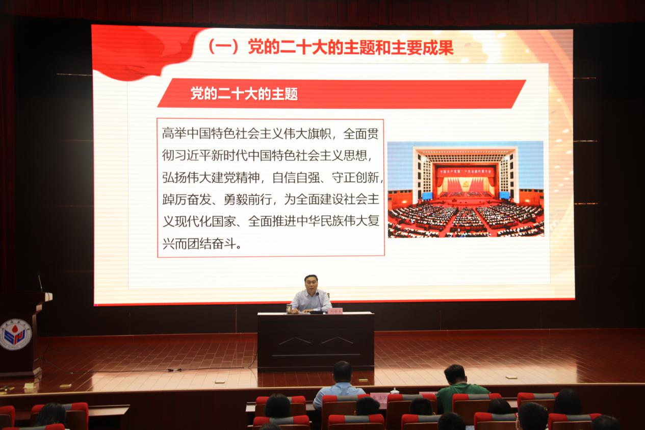 围绕报告主题,刘新生从全面准确把握党的二十大精神、不断开创高等教育高质量发展新局面和努力做学思践悟习近平新时代中国特色社会主义思想的青年表率这三部分展开讲述。一是通过深入阐释关于党的二十大的主题与主要成果、过去5年的工作和新时代10年的伟大变革、马克思主义中国化时代化、中国式现代化等相关内容,使大家更加全面准确把握党的二十大精神;二是围绕学校、学院近年来取得的发展成果,阐述了学院如何深入学习贯彻党的二十大精神,不断开创高等教育高质量发展新局面;最后,刘新生还对同学们提出期望,广大青年要以党的二十大精神为指引,把学思践悟习近平新时代中国特色社会主义思想作为终身必修课,争做有理想、有本领、有担当的新时代青年,为实现中华民族伟大复兴的中国梦贡献智慧和力量。