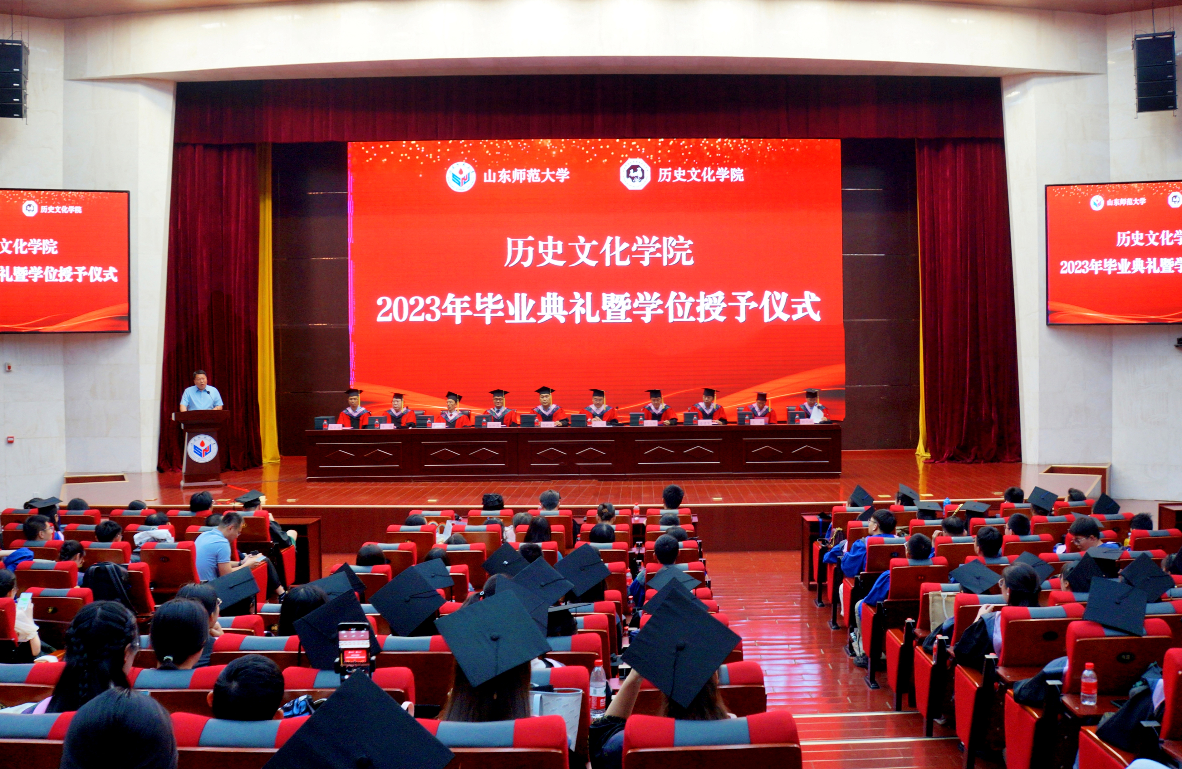 6月14日下午,历史文化学院于长清湖校区树蕙堂第一报告厅举行2023年毕业典礼暨学位授予仪式。历史文化学院党委书记刘新生、院长毛锐等学院领导班子成员出席活动。学院学位评定分委员会成员、教师代表、全体辅导员和2023届毕业生、部分2020届毕业生参加典礼。典礼由学院党委副书记鲁法军主持。