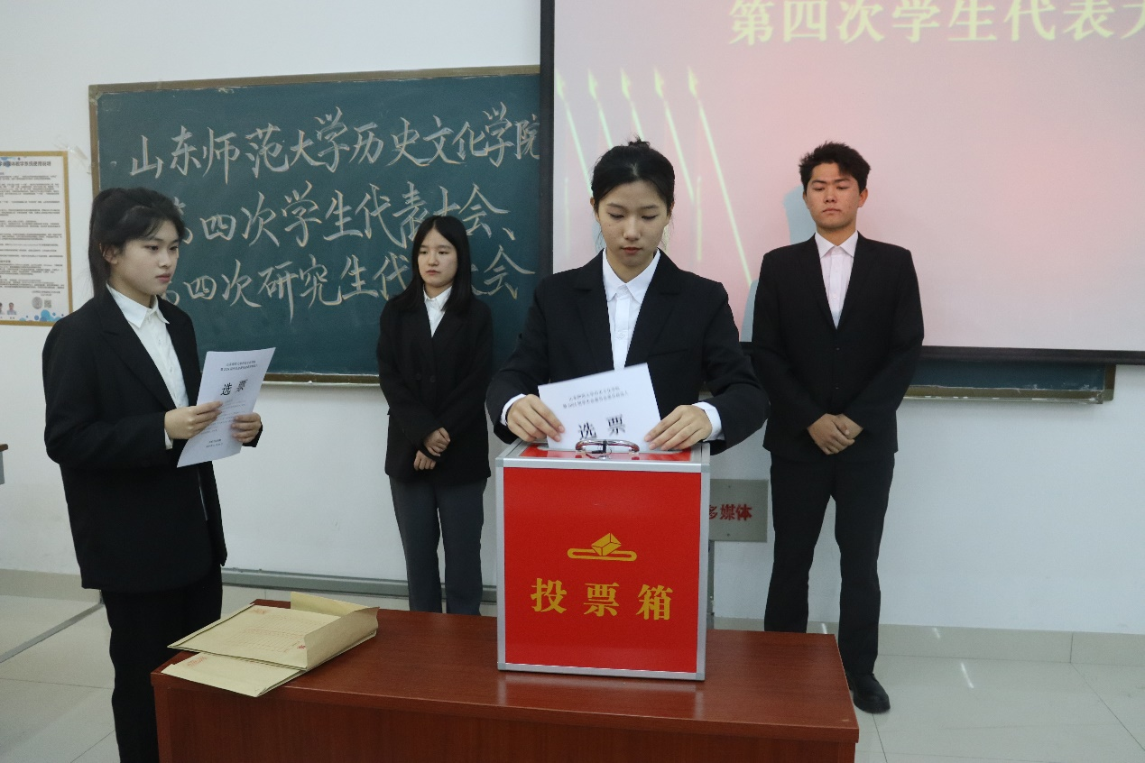 学院学生会轮值主席曹文晗向大家作了学生会工作报告。与会代表听取了《学代会资格审查报告》,审议通过了学代会各项议程。表决通过了大会选举办法及大会监票人、计票人名单,审议并通过了《山东师范大学历史文化学院学生会工作报告的决议》,通过了山东师范大学历史文化学院第2024届学生会主席团、学生委员会候选人名单,最后与会代表通过无记名投票的方式选举产生了新一届学生会委员及主席团。