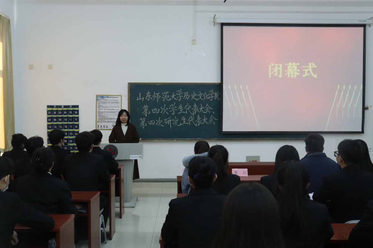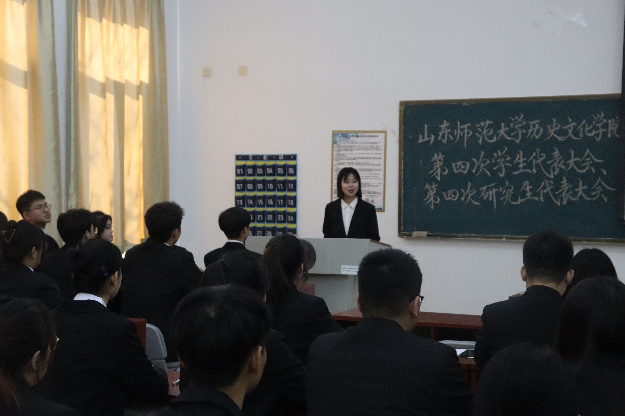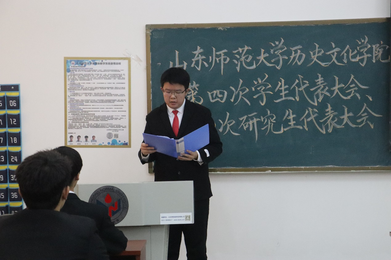 11月30日,历史文化学院第四次学生代表大会、第四次研究生代表大会在长清湖校区崇德楼116教室隆重召开。学院学生工作办公室主任、团委书记董欣、辅导员刘畅、衣晓杰、李慧颖和全体正式代表出席会议。