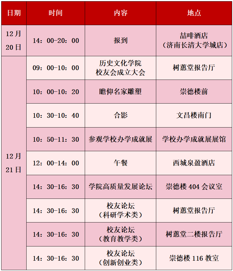 自历史文化学院校友会成立筹备1号、2号公告发布以来,得到了各级领导、学院全体师生、海内外校友和社会各界的热切关注和鼎力支持,在此谨致以诚挚的感谢和崇高的敬意!为深化校友间的联结,构筑校友与学院间更为坚实的纽带,此刻,我们满怀激动之情向大家郑重宣布山东师范大学历史文化学院校友会成立大会暨高质量发展论坛将于2024年12月21日在长清湖校区隆重举行。是日,我们期盼诸位莅临,共襄盛举,共同绘就属于历史文化学院校友的新蓝图。