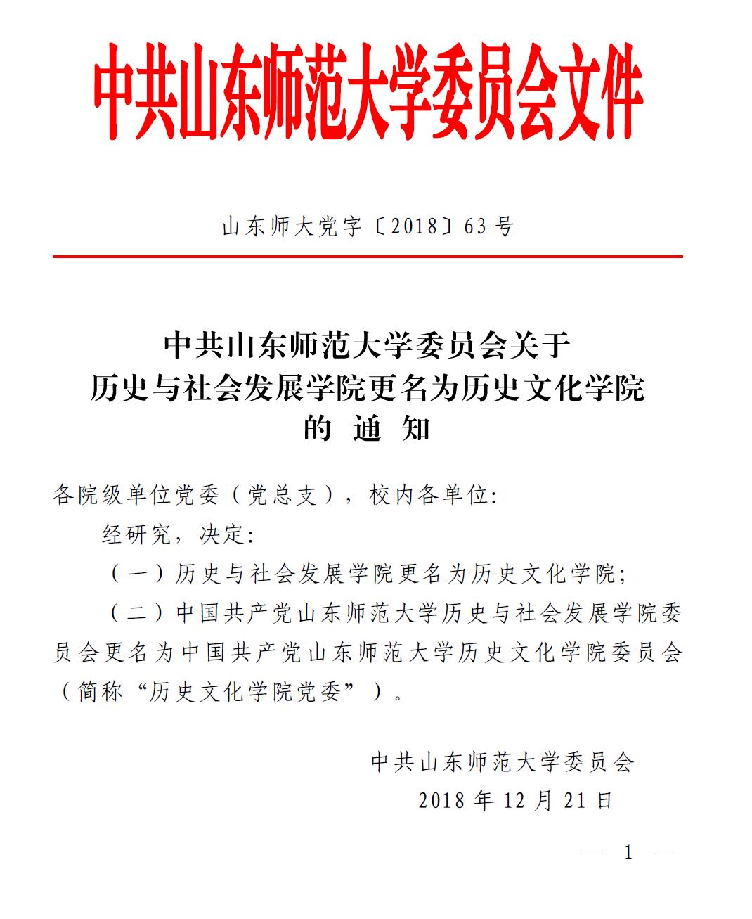 近日,中共山东师范大学委员会发布【山东师大党字〔2018〕63号】文件,文件称:学校研究决定,历史与社会发展学院更名为历史文化学院;中国共产党山东师范大学历史与社会发展学院委员会更名为中国共产党山东师范大学历史文化学院委员会(简称“历史文化学院党委”)。