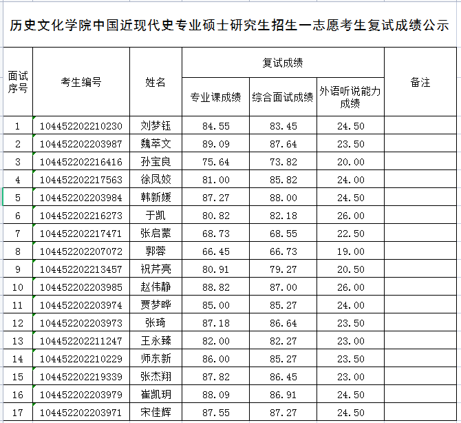 历史文化学院中国近现代史专业硕士研究生招生一志愿考生复试成绩公示