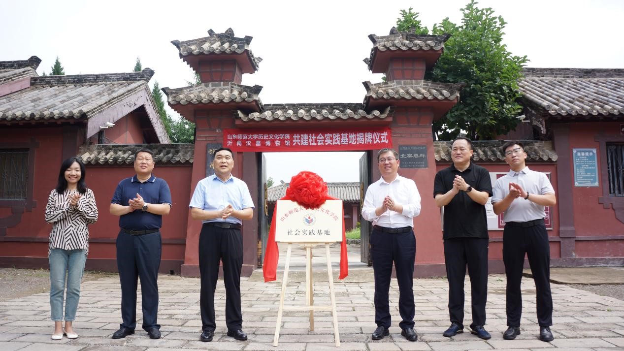 7月18日,山东师范大学历史文化学院“史话齐鲁精神,传承红色基因”学子宣讲队暑期社会实践团走进临沂市沂南汉墓博物馆,开展参观调研与共建社会实践基地揭牌仪式。历史文化学院党委书记刘新生,党委副书记鲁法军,团委书记董欣,辅导员于一凡一行,与沂南县文化和旅游局局长董守胜,沂南县交通运输局党组成员、沂南县交通运输事业服务中心主任尹永来,共同出席共建实践基地揭牌仪式。