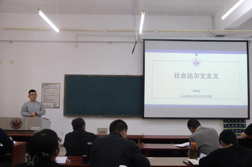 张凯成老师以“社会达尔文主义”为题开展了课程展示,通过电影流浪地球中的片段引入,极大的激发了听众的兴趣。他指出社会存在决定社会意识,介绍了历史上奋起抗争,变法维新的政治主张。