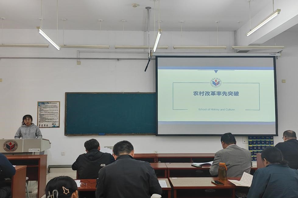 黄润青老师以“农村改革率先突破”为题进行课堂展示,她首先以小岗村的故事为引入,又通过详细具体的数据表格进一步分析观点。其中她提出了“借地度荒”的问题并展开深入分析。在展示过程中引用了等丰富的史学材料,让听众能够更具体更生动的理解改革内涵。