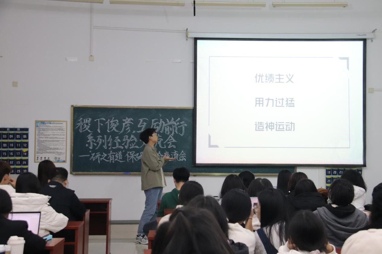 随后,由推免至东北师范大学的李睿帆同学分享自己的推免经验。她强调了明确个人方向的重要性,希望同学们对于未来规划能够做出合适的选择。她分享了个人的成绩与排名,并且结合自身历程向同学们分享时间分配管理和心态调节方法。她重点介绍了如何在保研过程中保持积极心态和高效备考。保研是一场持久战,李睿帆建议同学们应当提前规划,科学安排时间。她希望同学们不断挖掘自身优势,同时紧抓每一个可能的机会,在保研的征途上稳步前行。