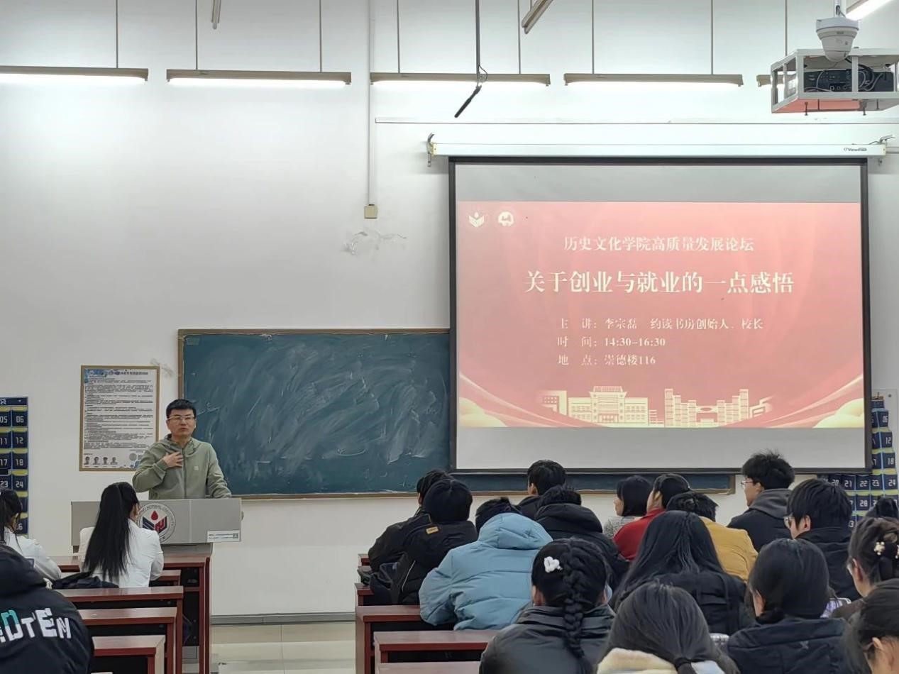 12月21日,历史文化学院在长清湖校区崇德楼116教室成功举办创新创业校友论坛《关于创业与就业的一点感悟》。本次论坛由2001级校友、约读书房创始人、校长李宗磊主讲,学院团委书记、学生工作办公室主任董欣主持,2023级本科生参与本次论坛。