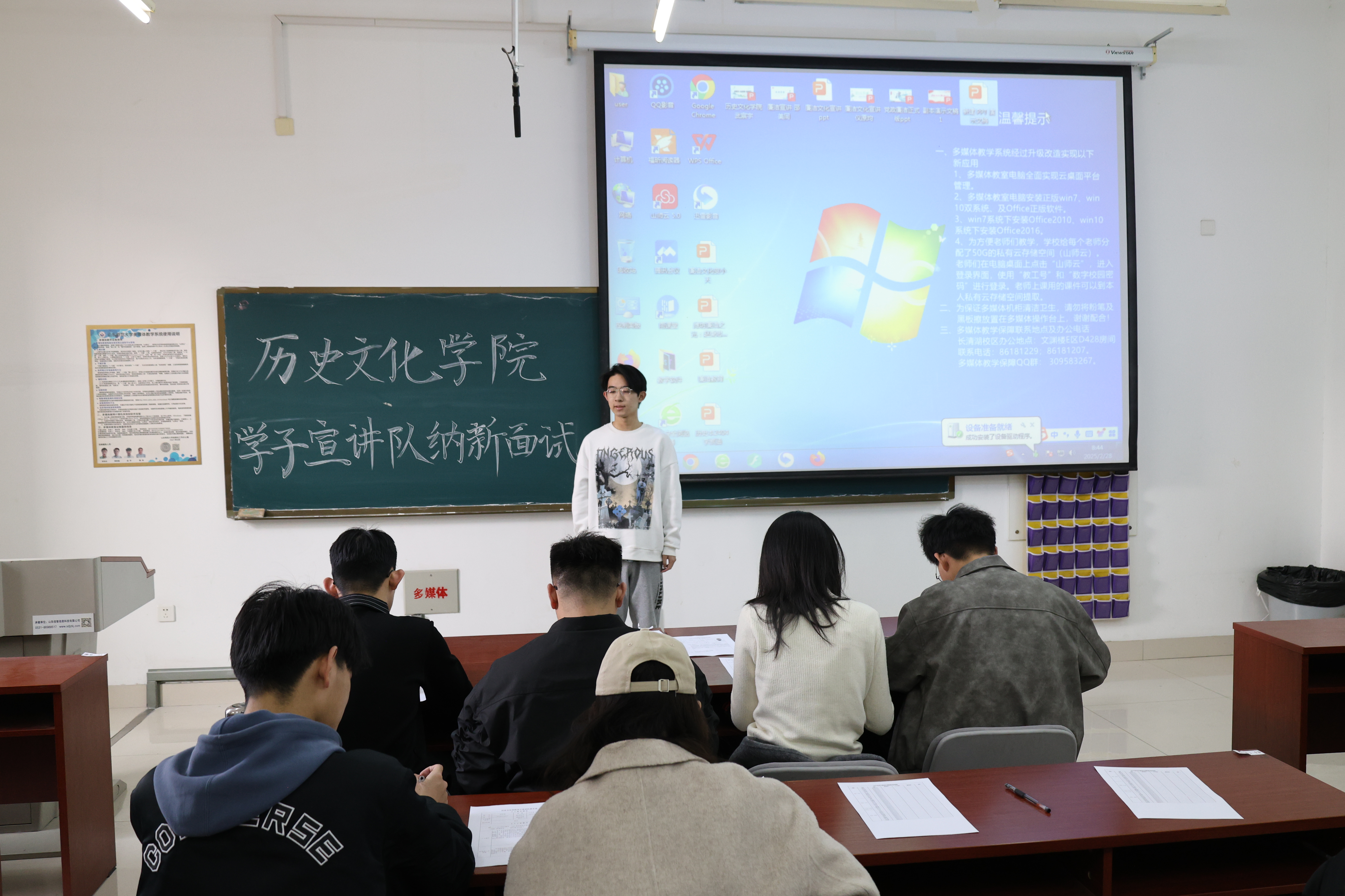 为进一步凝聚青年力量,更好地开展新学期宣讲活动,2月28日,历史文化学院在崇德楼216教室进行学子宣讲队纳新活动。本次纳新面试由2024级辅导员于一凡、学子宣讲队骨干成员担任评委。