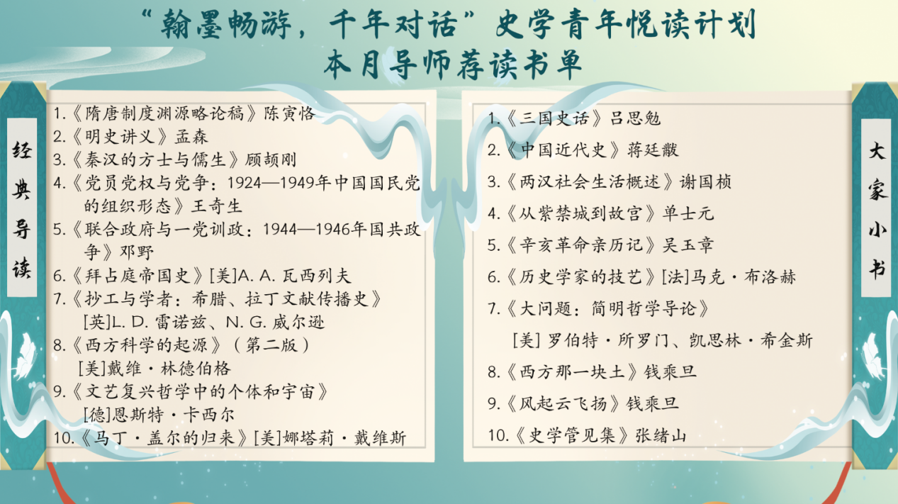 本次“翰墨畅游,千年对话”史学青年悦读计划以培养广大学子积极阅读氛围为核心,着力构建“兴趣激发-习惯养成-素养提升”的成长路径。通过这一循序渐进的阅读促进机制,推动青年学子实现从“乐于开卷”到“勤于思考”再到“精于治学”的阶梯式发展,让书香浸润校园,让阅读照见未来。