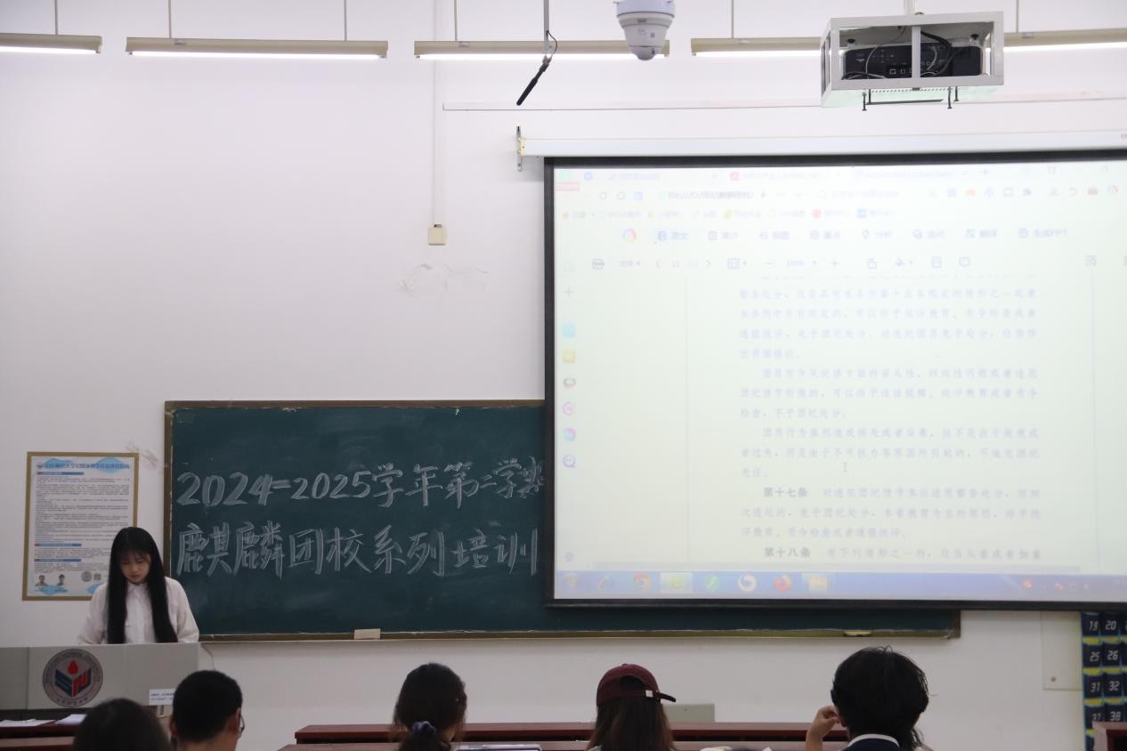 为深入贯彻落实全面从严治团要求,强化共青团组织纪律建设,提升团干部及新发展团员的纪律意识与责任担当,历史文化学院于4月13日晚上在崇德楼116教室成功举办2024-2025学年第二学期第六期麒麟团校——“纪律铸魂·青春砺行”主题培训。此次培训会由学院学生会秘书处秘书长刘佳宇主讲,2022级、2023级、2024级团干部及2025上半年新发展团员参与学习。