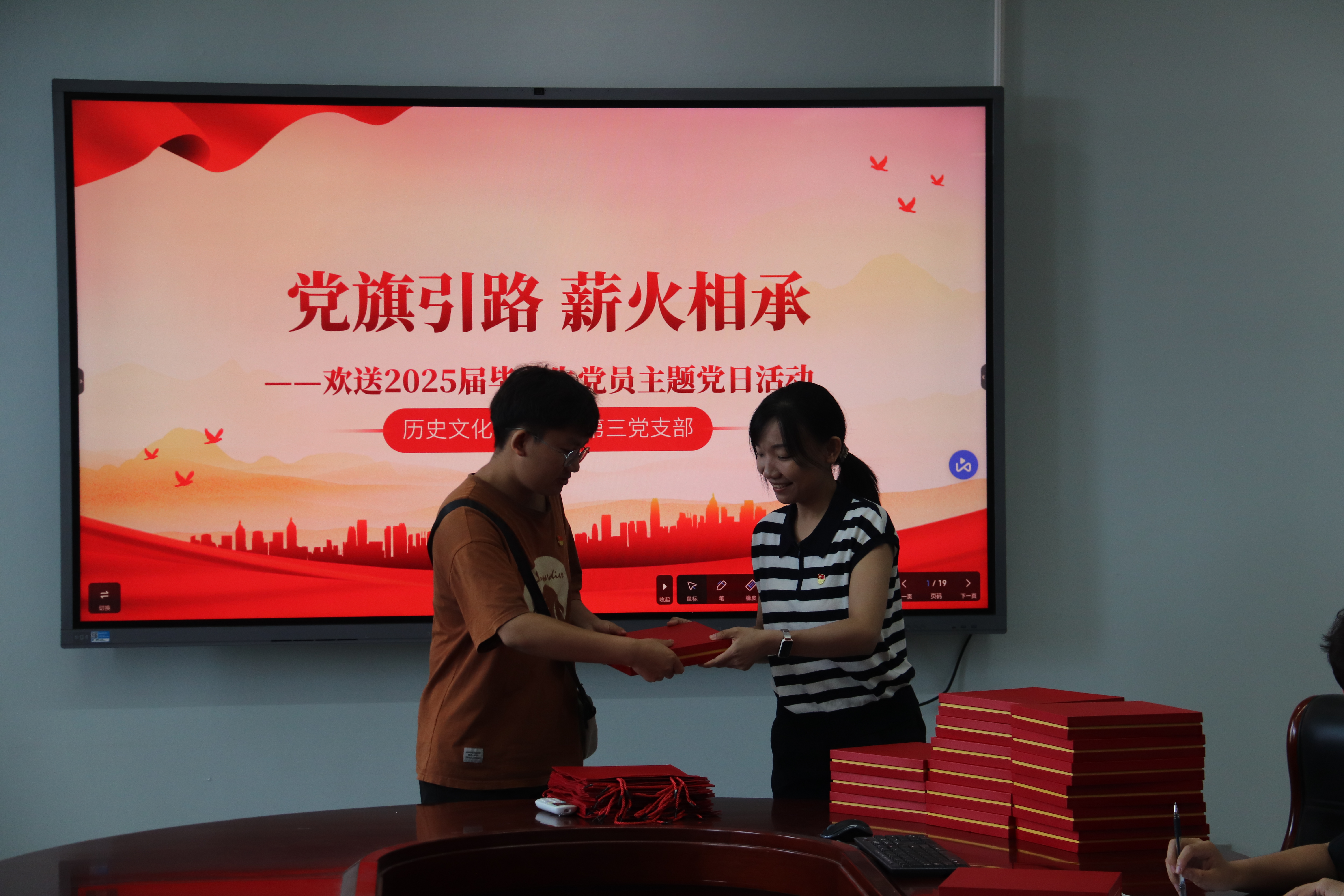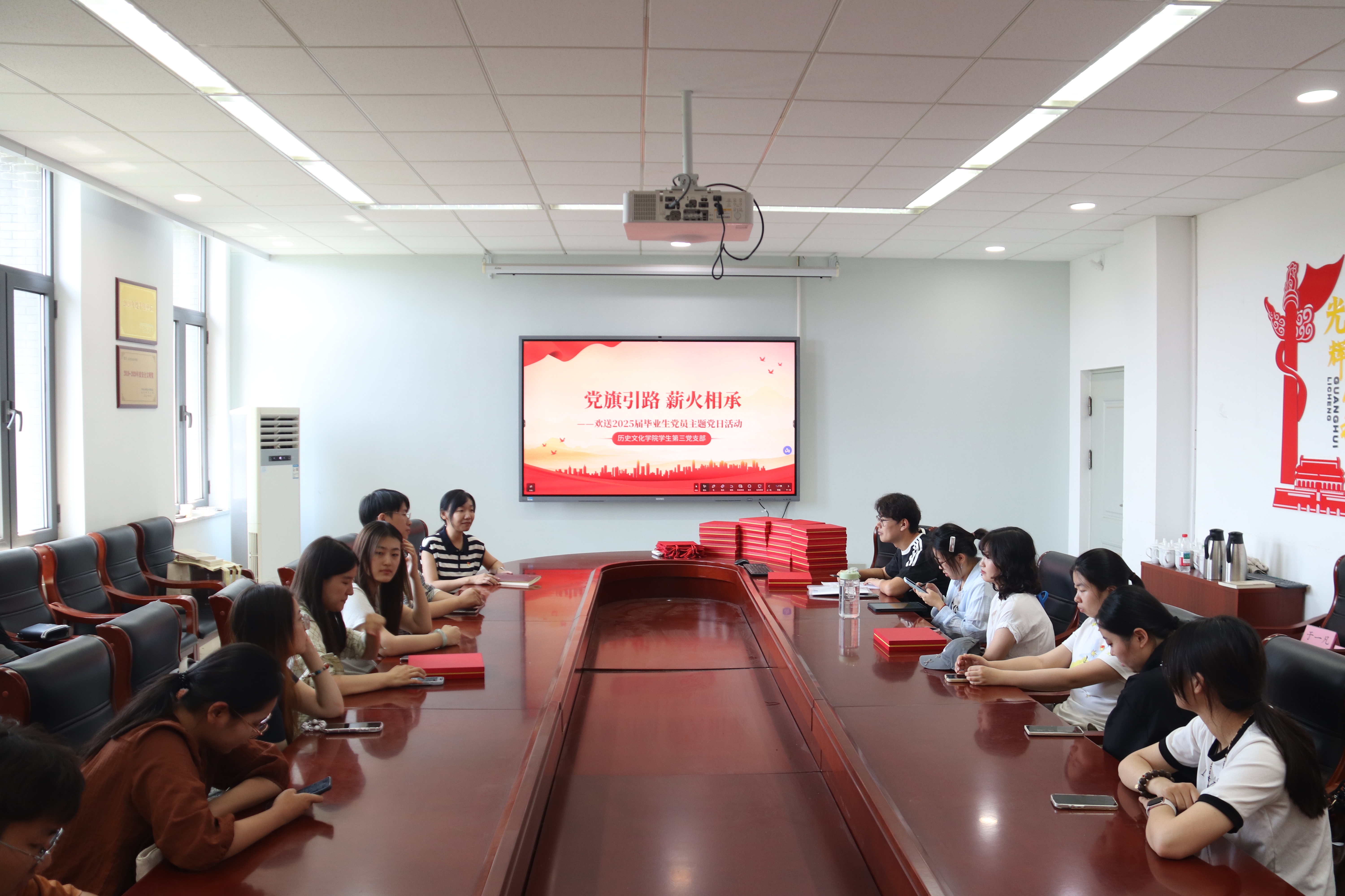 盛夏蝉鸣起,骊歌缓缓奏。在这个满载收获与离别的季节,历史文化学院学生第三党支部于6月13日中午举办“党旗引路 薪火相承”欢送2025届毕业生党员主题党日活动。活动由党支部书记董欣主持,支部全体党员齐聚一堂,在温馨热烈的氛围中,共忆往昔情谊,共话未来期许。