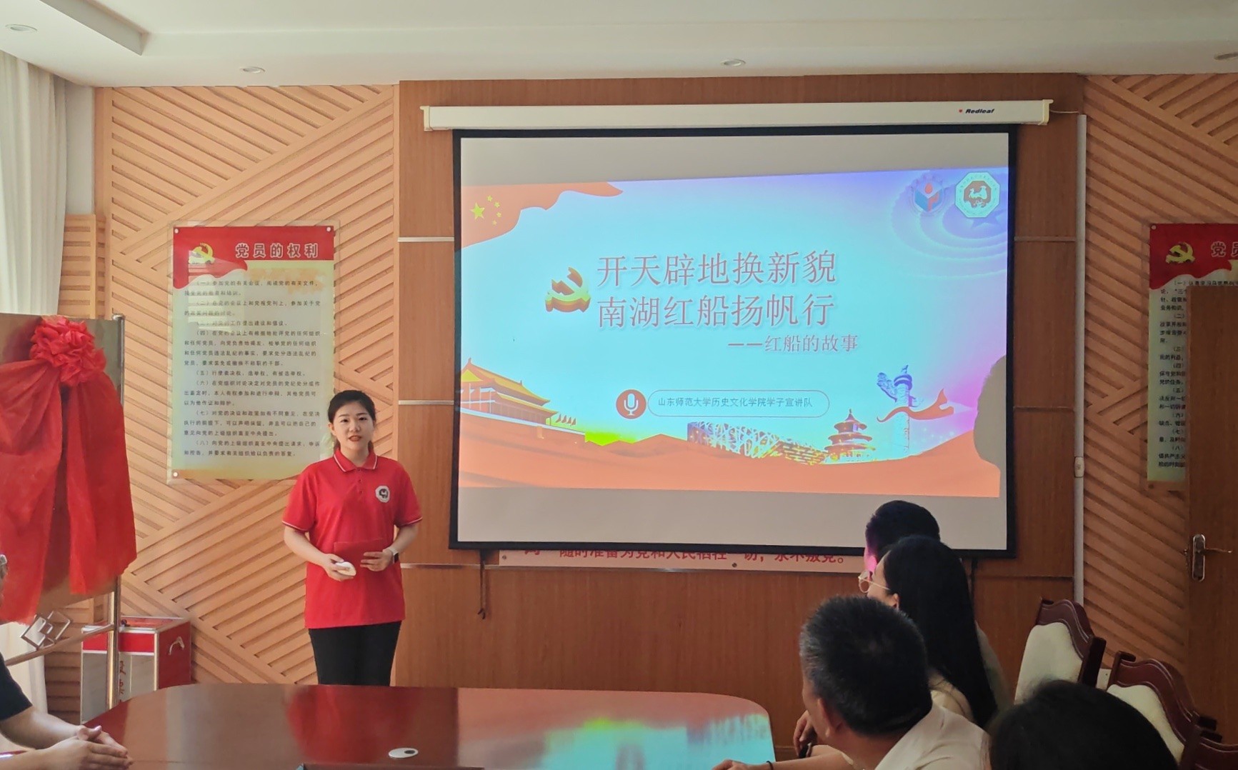 参观结束后,实践团成员张雅晗以《开天辟地换新貌,南湖红船扬帆行》为题,在馆内进行了“重温中共一大党史”主题宣讲。恰逢建党104周年,她声情并茂地讲述了1921年中共一大在上海召开、后转移至嘉兴南湖红船完成会议宣告中国共产党诞生的伟大历程,阐述了红船精神“开天辟地、敢为人先的首创精神,坚定理想、百折不挠的奋斗精神,立党为公、忠诚为民的奉献精神”的深刻内涵及其作为建党精神之源的重要意义。宣讲在齐唱《没有共产党就没有新中国》的歌声中圆满结束。