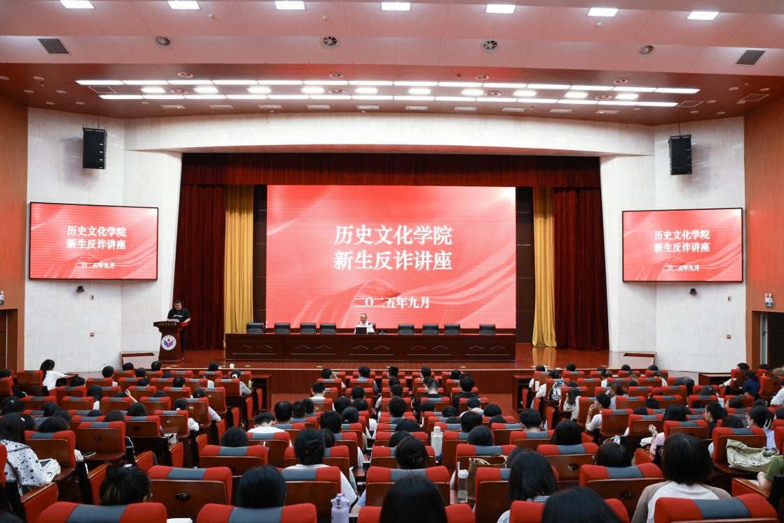 为切实提升2025级新生识别与防范诈骗的能力,进一步提升校园反诈骗宣传教育实效性,9月11日下午,历史文化学院于长清湖校区树蕙堂第一报告厅举办新生反诈专题讲座。长清公安分局驻校高级干警李卫军担任主讲人,学院党委副书记、纪委书记鲁法军,团委书记、学工办主任董欣出席活动。讲座由2025级本科生辅导员童子豪主持,2025级全体新生参加学习。
