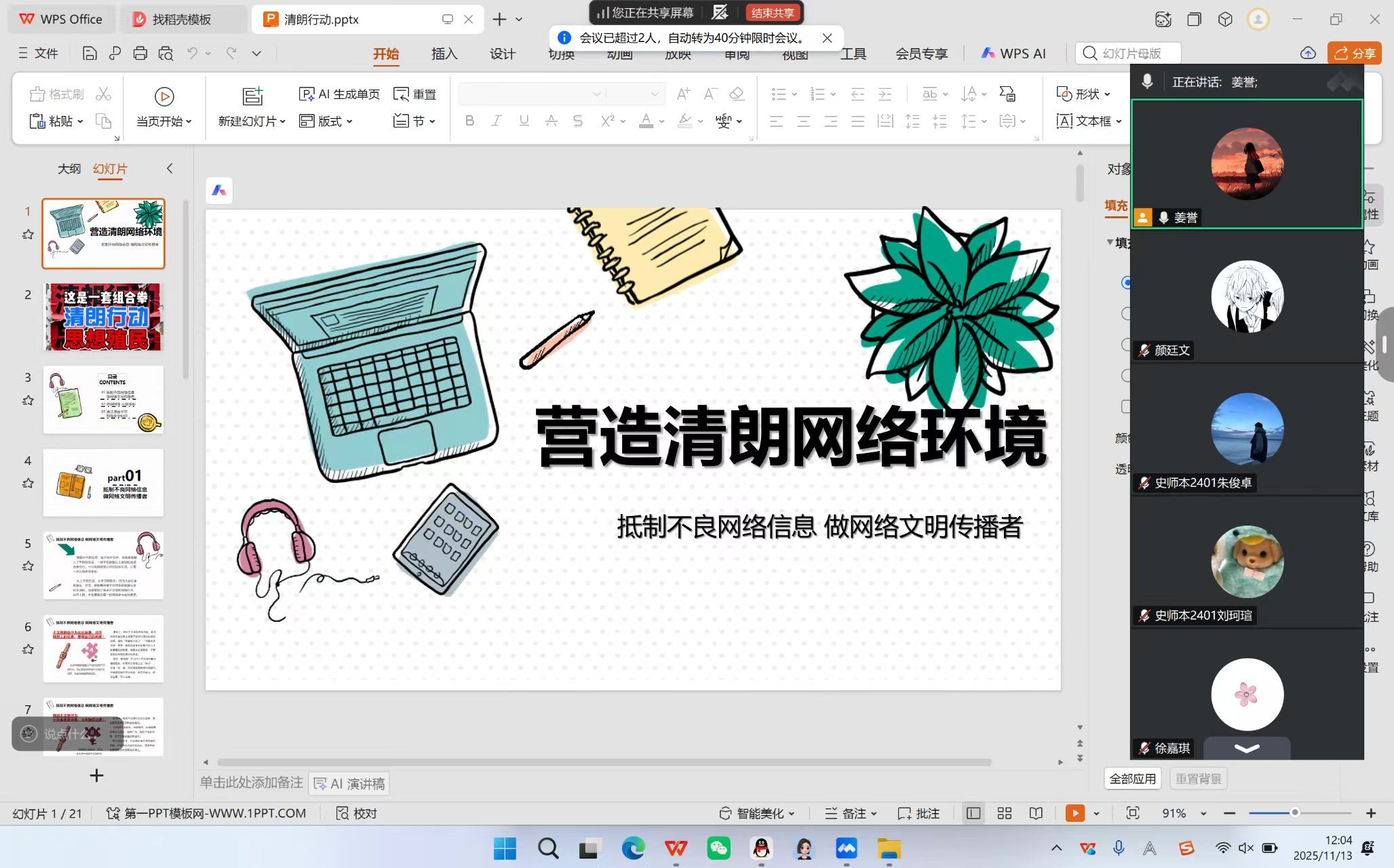 线上会议环节,各班级通过播放网络文明教育视频,直观呈现不良网络用语对个人语言习惯、思维方式的潜在负面影响,以生动鲜活的案例引导同学们规范使用网络语言表达。班会同步发起“文明上网”倡议,呼吁大家自觉抵制网络谣言、网络暴力、虚假信息等违法违规乱象,主动担当网络文明践行者、传播者的责任,以实际行动守护健康网络生态。