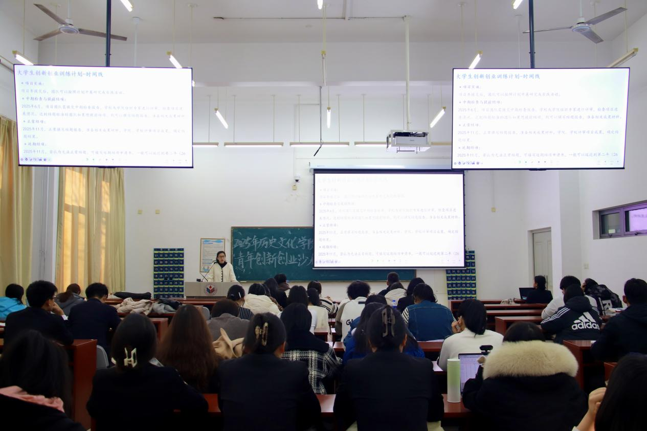 为增进同学们对“大学生创新创业训练计划”等竞赛流程及相关内容的了解,11月27日,历史文化学院于崇德楼116教室成功举办青年创新创业沙龙活动。本次活动由2024级辅导员于一凡主持,2022级本科生李然担任主讲,学院百余名同学积极参与。