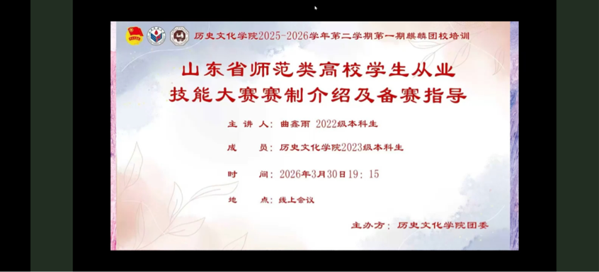 为帮助学生明晰赛事要求、夯实教学技能,3月30日晚,历史文化学院于线上开展2025-2026学年第二学期第一期麒麟团校培训。本次培训以山东省师范类高校学生从业技能大赛赛制介绍及备赛指导为主题,历史文化学院2022级本科生曲鑫雨担任主讲,学院2023级全体本科生参加培训。