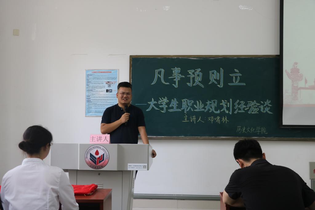 2019年6月5日上午,由历史文化学院举办的“大学生生涯发展大讲堂”之“凡事预则立—大学生职业规划经验谈”主题讲座于崇德楼114教室正式开讲。本次讲座由历史文化学院2016届历史学毕业生邓啸林主讲,历史文化学院党委副书记鲁法军、辅导员高伟出席,百余名学生积极到场聆听。
