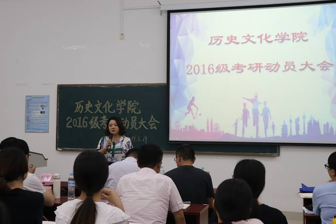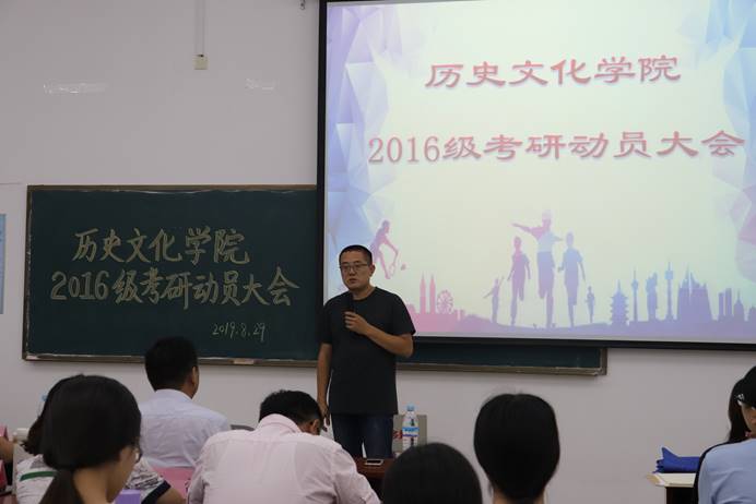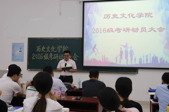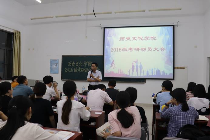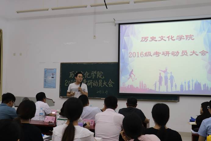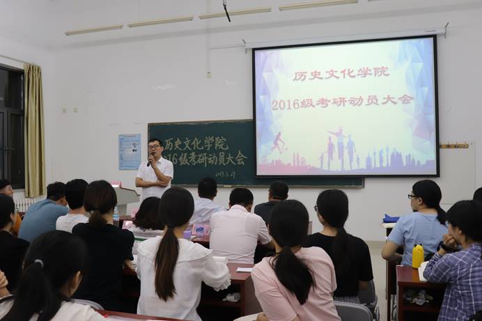8月29日晚,历史文化学院于长清湖校区崇德楼114室举办2016级考研动员大会。山东大学儒学高等研究院教授王加华、山东师范大学历史文化学院副院长赵树国、副教授楼建军,青年教师刘本森、杨蕾、孙超,出席本次大会,对到场2016级学生进行指导。