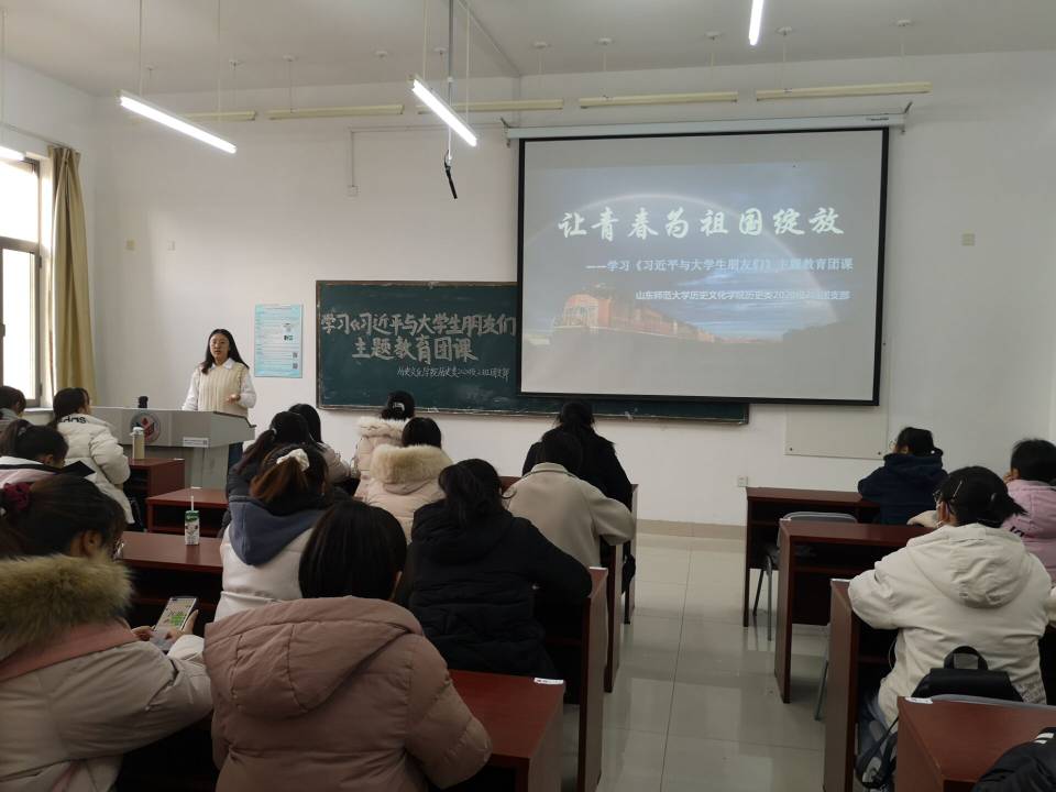为响应校团委号召,推动习近平新时代中国特色社会主义思想在广大青年学生中入脑入心、落地生根,1月4日至11日,历史文化学院组织开展“让青春为祖国绽放”——学习《习近平和大学生朋友们》主题团日活动。本次活动以支部为单位组织团员开展,学院全体本科生和研究生共31个团支部以多种形式积极参与。