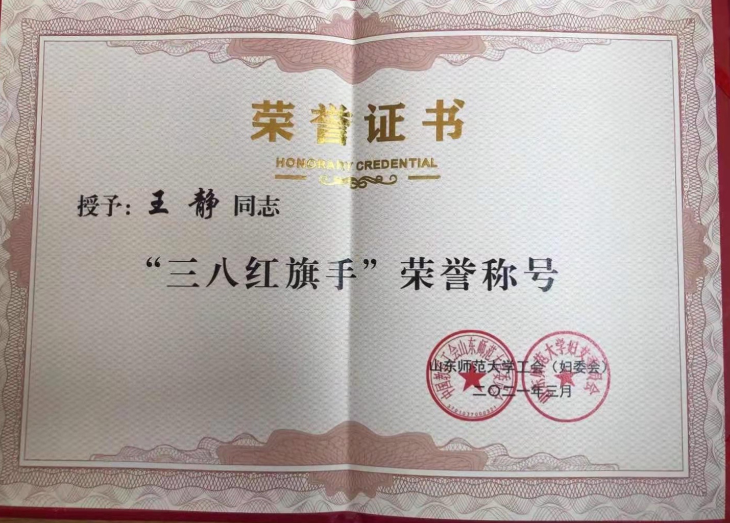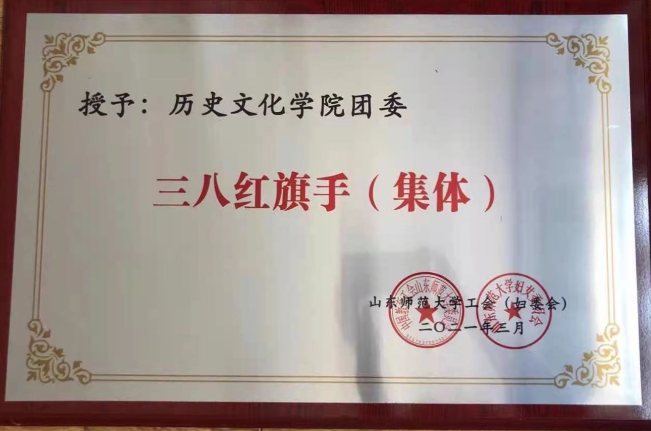 为表彰先进,树立典型,引导和激励广大女教职工爱岗敬业、争先创优、奋发有为,近日,山东师范大学授予历史文化学院团委“三八红旗手(集体)”荣誉称号,王静教授荣获“三八红旗手”荣誉称号。