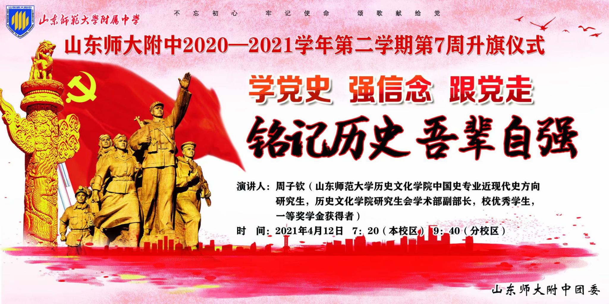 为发挥专业优势,庆祝建党一百周年,推动党史学习教育行稳致远,增强青年学子爱党爱国热情,历史文化学院团委与山师附中团委就党史学习与教育工作展开了交流。2021年4月12日上午,我院2020级中国史班研究生周子钦参加山东师范大学附属中学升旗仪式,并在两校区发表以“铭记历史,吾辈自强”为主题的国旗下演讲。