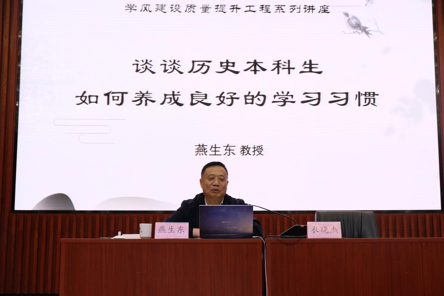 最后,燕生东教授作了题为“谈谈历史本科生如何养成良好的学习习惯”的主题讲座。伊始,燕教授以个人亲历事例为切入点,引出本场讲座的主题,详细分析我们迫切改进学风建设的原因:一是大学生正值学习的黄金时期,不应轻易虚度年华;二是大学学习区别于过往,要求学生拥有较强的自主学习能力;三是当今社会工作形势严峻,“逢进必考”的招聘机制极大地拔高大学生的素质门槛;四是大量留学回国的求职人士加剧竞争态势,致使国内大学生的就业压力剧增。然后,燕教授结合自身求学工作经历,建议同学们在大学时期必须锻炼以下四种能力:阅读能力、写作能力、语言能力、沟通协调能力;最后,燕教授对历史本科生如何养成良好的学习习惯提出一系列建议。他指出,同学们首先应该做到课上主动学习,严格遵循上课不迟到、不早退、不旷课、不玩手机的原则;其次,他建议同学们应积极发挥主观能动性,在课堂后多下功夫,广泛阅读专业相关书籍,利用暑假时间积极参与学院老师的科研项目,还要课余时间多参加集体和实践活动以提升专业素质和综合能力。
