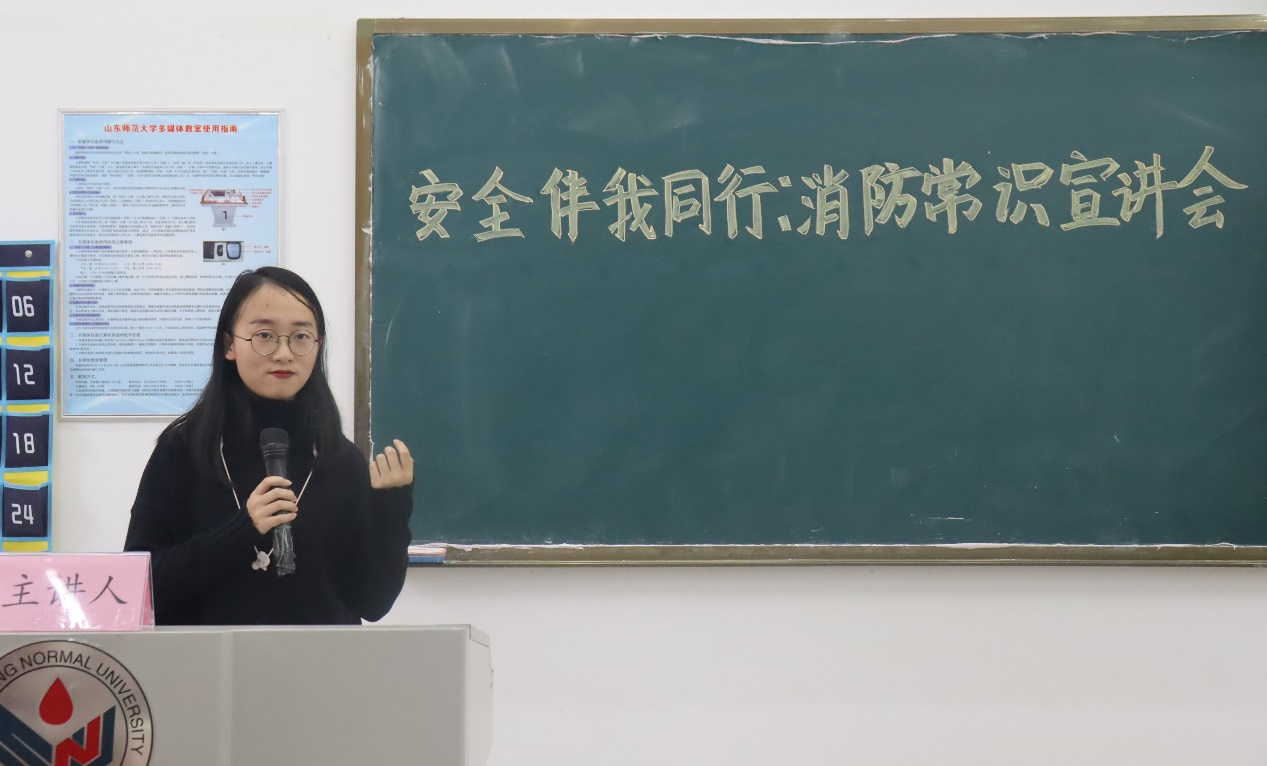 随后,山东师范大学消防志愿者服务队邓忠欣同学给大家介绍了消防器具的使用和很多日常生活中的消防安全常识,还与在场同学进行问答互动,同学们参与热情十分高涨。最后,在场同学集体观看了关于消防安全宣传片,更加直观的认识到了消防安全的重要性,同学们纷纷表示会从自身做起、从点滴做起,将安全工作扎扎实实落实到位。