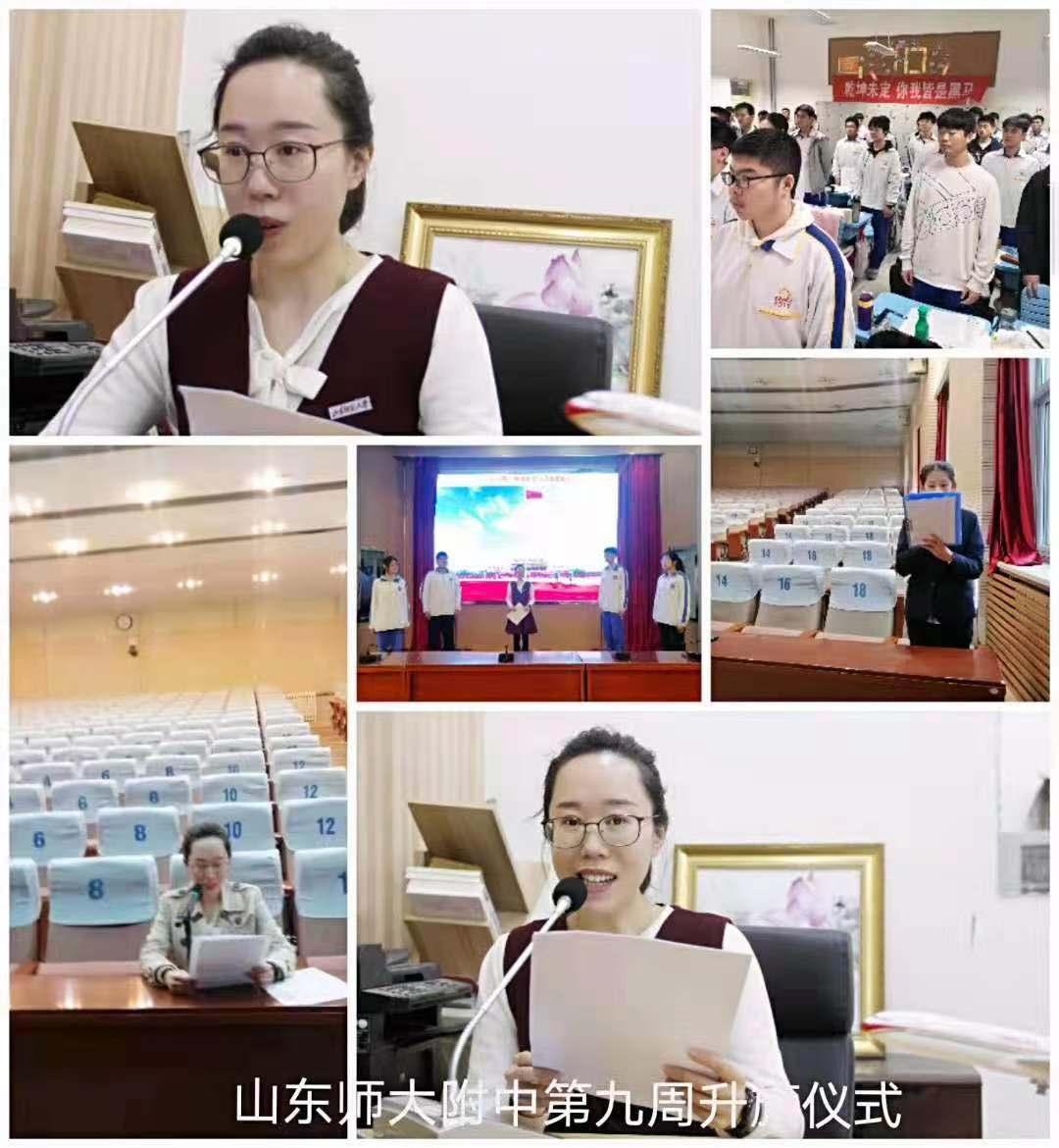 为庆祝建党100周年,切实推动党史学习教育深入基层,扎实推进广大师生在学深悟透、知行合一上下真功夫,引导广大青少年在百年党史中坚定理想信念,传承红色基因,为两校高质量发展汇聚新动能,历史文化学院团委与山师附中团委就党史学习教育工作展开了交流。2021年4月26日上午,我院团委宣传委员、2020级辅导员、山师大附中校友蒋艺参加了山东师范大学附属中学升旗仪式,并在两校区发表以“那腔热血,温暖了这美丽中国”为主题的国旗下演讲。由于天气原因,此次国旗下演讲在室内举行。