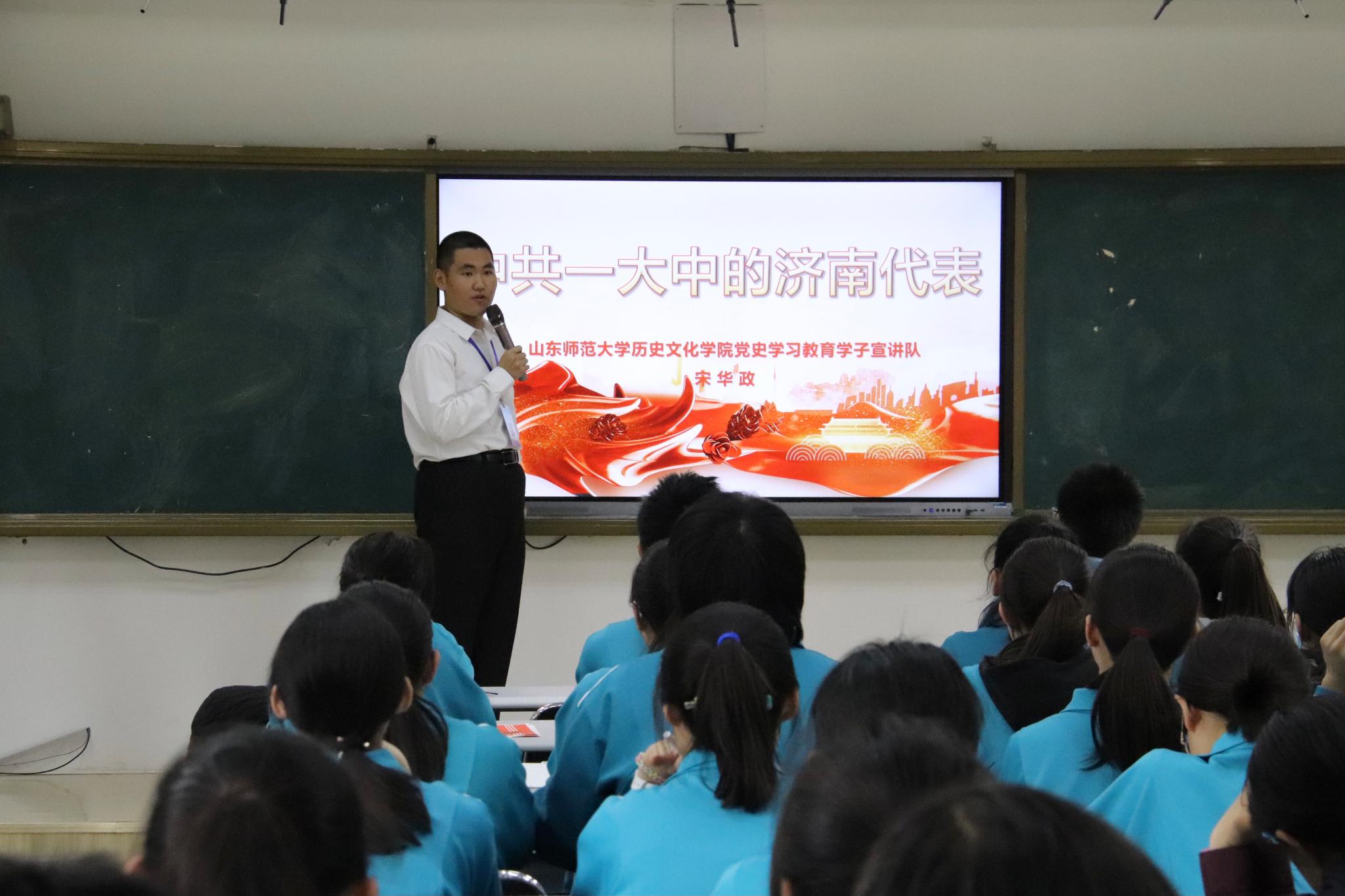 为庆祝建党100周年,在党史学习中砥砺初心使命,汲取奋进力量。4月29日中午,历史文化学院党史学习教育学子宣讲队在山东师范大学第二附属中学师大校区开展党史学习教育宣讲。学子宣讲队副队长宋华政在该校报告厅进行了以“中共一大中的济南代表”为主题的党史宣讲。该宣讲是二附中党史学习教育启动和2021年团校开班的第一课。二附中团委书记魏煜钢,各年级共青团员、入团积极分子,以及历史文化学院团委书记魏宁,学子宣讲队部分成员共80余人参加了本次宣讲活动。