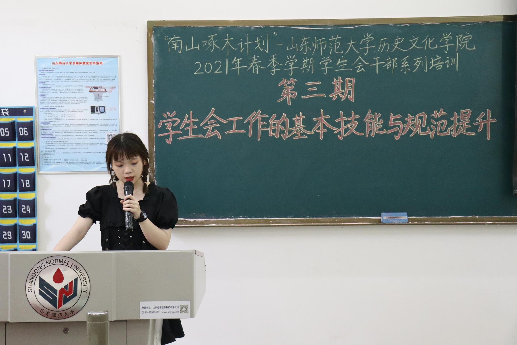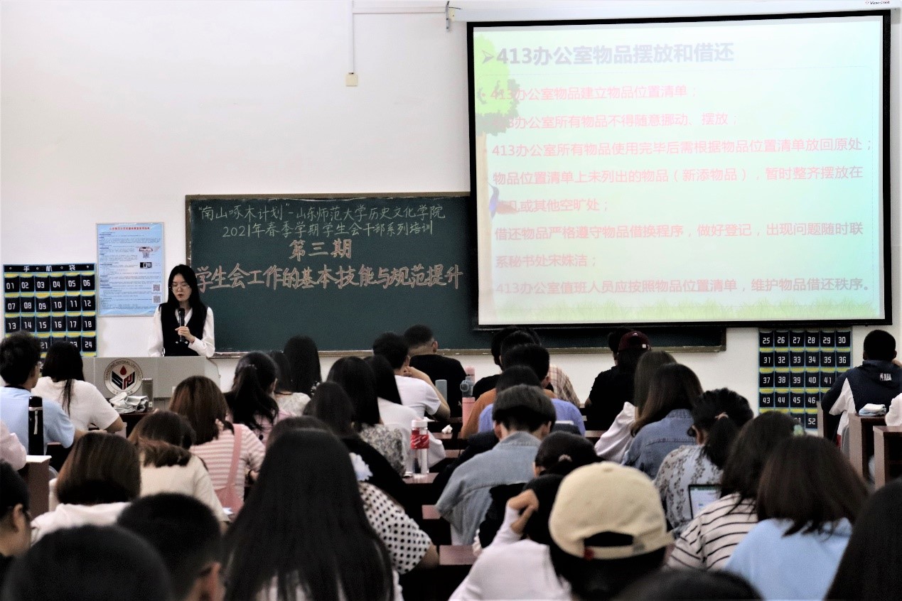 为传承学生会优良传统,5月13日,历史文化学院于长清湖校区崇德楼114教室举办了“南山啄木计划”山东师范大学历史文化学院2021年春季学期学生会干部系列培训的第三期“学生会工作的基本技能与规范提升”的培训会。历史文化学院学生会秘书处主讲,历史文化学院2021届学生会全体成员及青年媒体中心主席团、部长、副部长参加。