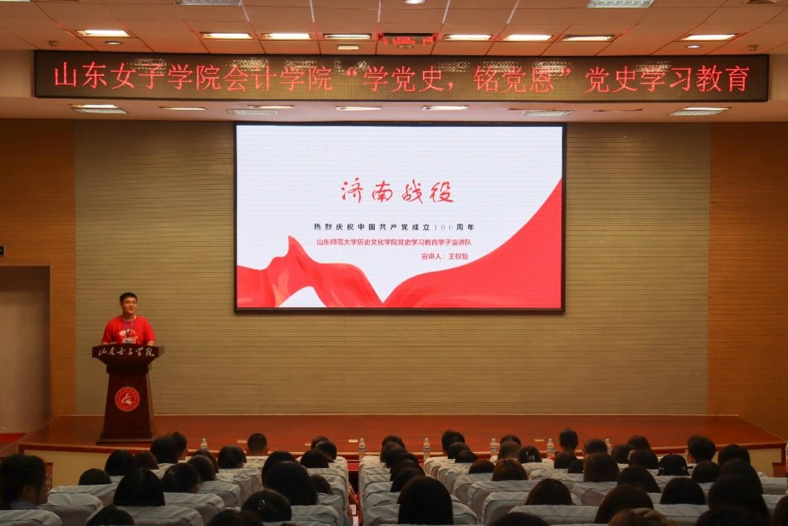 在图书馆第一报告厅,宣讲队成员王权哲进行了题为“济南战役”的党史宣讲,会计学院2018级、2019级和2020级本科生220余人参加本次宣讲活动。他从济南战役的背景、过程、影响和评价四个方面,用生动的事例讲述了我党我军激烈战斗、英勇无畏和攻坚取胜的伟大斗争。他又联系青年实际,倡议同学们学习济南战役中我党我军的伟大精神,争做新时代青年先锋。会计学院2019级朱函函听完宣讲后激动地说道:“听了今天的宣讲,我真切感受到了战争年代的动荡,更感觉现在的和平生活来之不易,我们不能忘记济南战役,不能忘记历史,要感恩英雄们的付出,要热爱我们伟大的祖国,要把红色基因传承下去。”