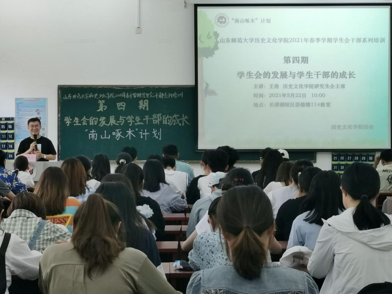 为传承历史文化学院学生会的优良传统,促进学生会的发展与学生干部的成长,5月22日上午,历史文化学院于长清湖校区崇德楼114教室召开了“南山啄木计划”山东师范大学历史文化学院2021年春季学生会干部系列培训的第四期“学生会的发展与学生干部的成长”培训会。本次会议由历史文化学院研究生会主席、历史文化学院2016届学生会主席王浩担任主讲,秘书处杨邵群主持,历史文化学院2021届学生会全体成员及青年媒体中心主要学生干部参加。