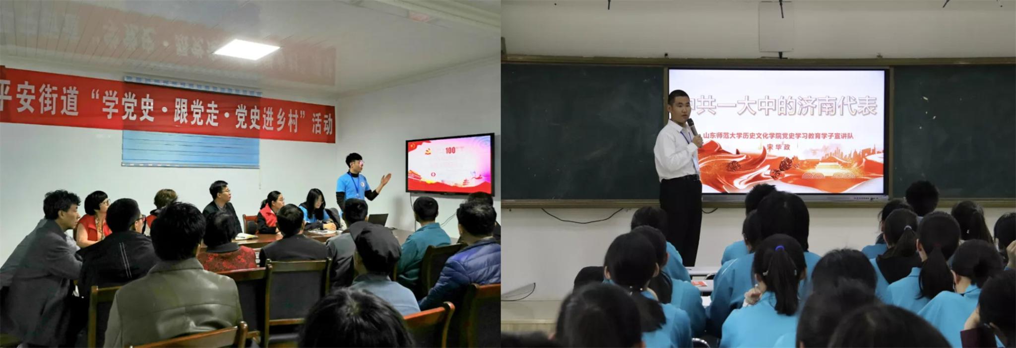 奋斗百年路,启航新征程。山东师范大学历史文化学院发挥专业优势,成立党史学习教育学子宣讲队,在党史学习教育中创新宣讲形式,讲好红色故事,砥砺初心使命,传承红色基因,汇聚发展共识,激发奋进力量。截至目前,学子宣讲队累计已开展党史宣讲40余场,覆盖机关党员干部、企事业单位员工、大中小学生、乡村社区党员群众等听众1万余人,切实推动党史学习教育“走新更走心”。