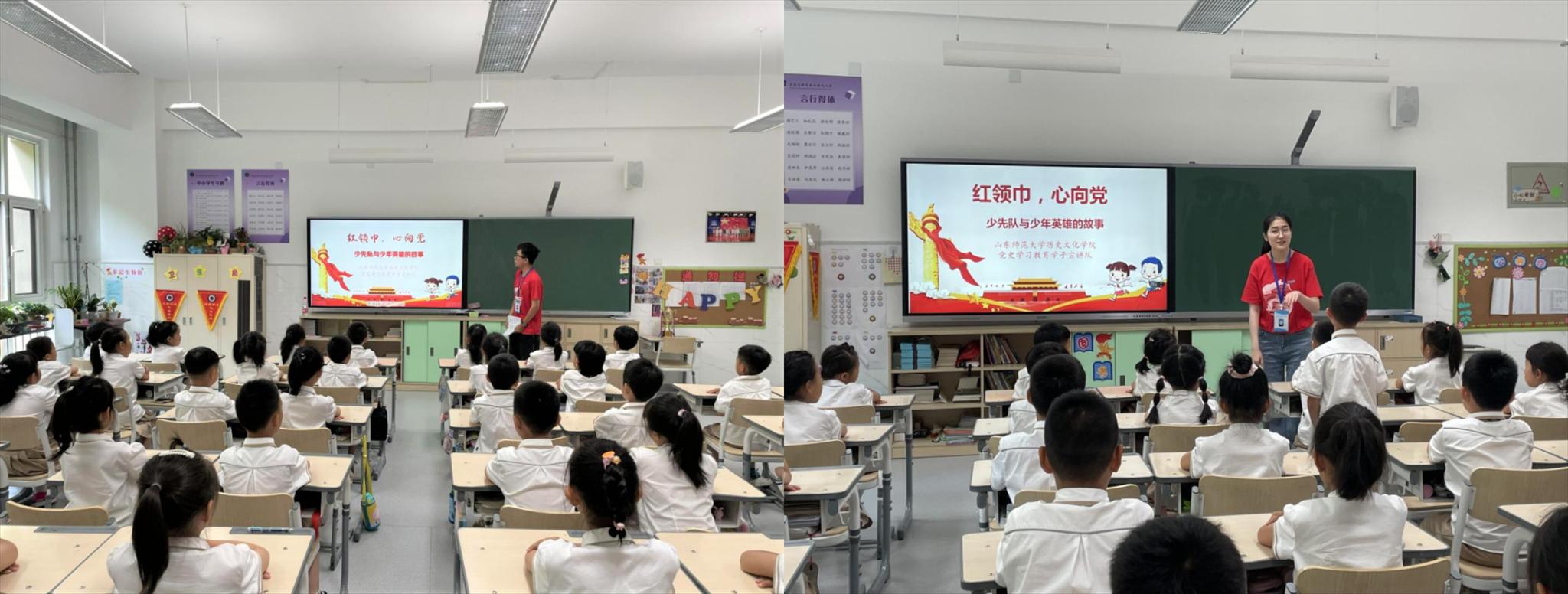 为庆祝建党100周年,在党史学习中砥砺初心使命,汲取奋进力量,6月7日上午,历史文化学院党史学习教育学子宣讲队在济南高新区金谷德艺小学进行了党史宣讲。宣讲队成员安芳醇、温琪钰、吴晗余、王春墨、李宁、路桐轩进行了以“红领巾,心向党——少先队与少年英雄的故事”为主题的党史宣讲,金谷德艺小学一年级、二年级学生等532人听了宣讲。