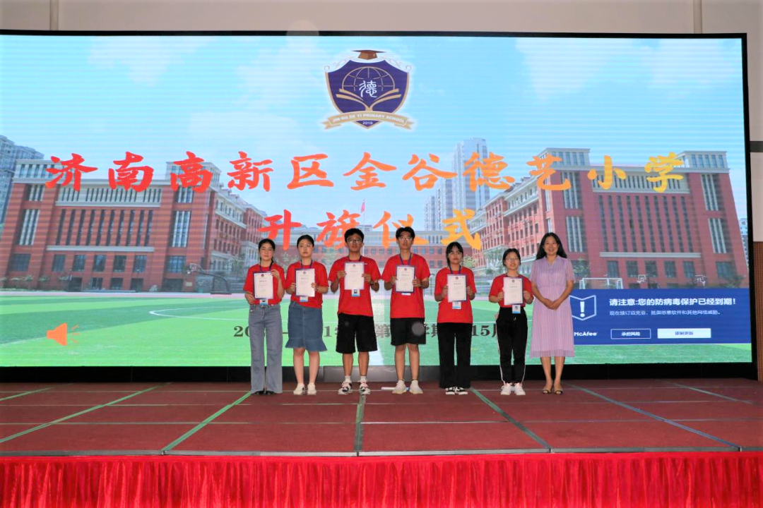 首先,金谷德艺小学在本周升旗仪式上介绍了我院党史学习教育学子宣讲队的基本情况,高度肯定了宣讲队的已有成果,并指出宣讲队切实做到了播撒红色基因,传承革命精神,让党史知识深入人心。接着,宣讲队成员王春墨作为学子宣讲队代表发言,表示要用少年儿童能听懂的语言讲好红色故事,激发他们学习党史的兴趣与热情,努力成为青年学生开展党史学习教育的一张亮丽名片。最后,校长张薏为宣讲队成员颁发了聘书。