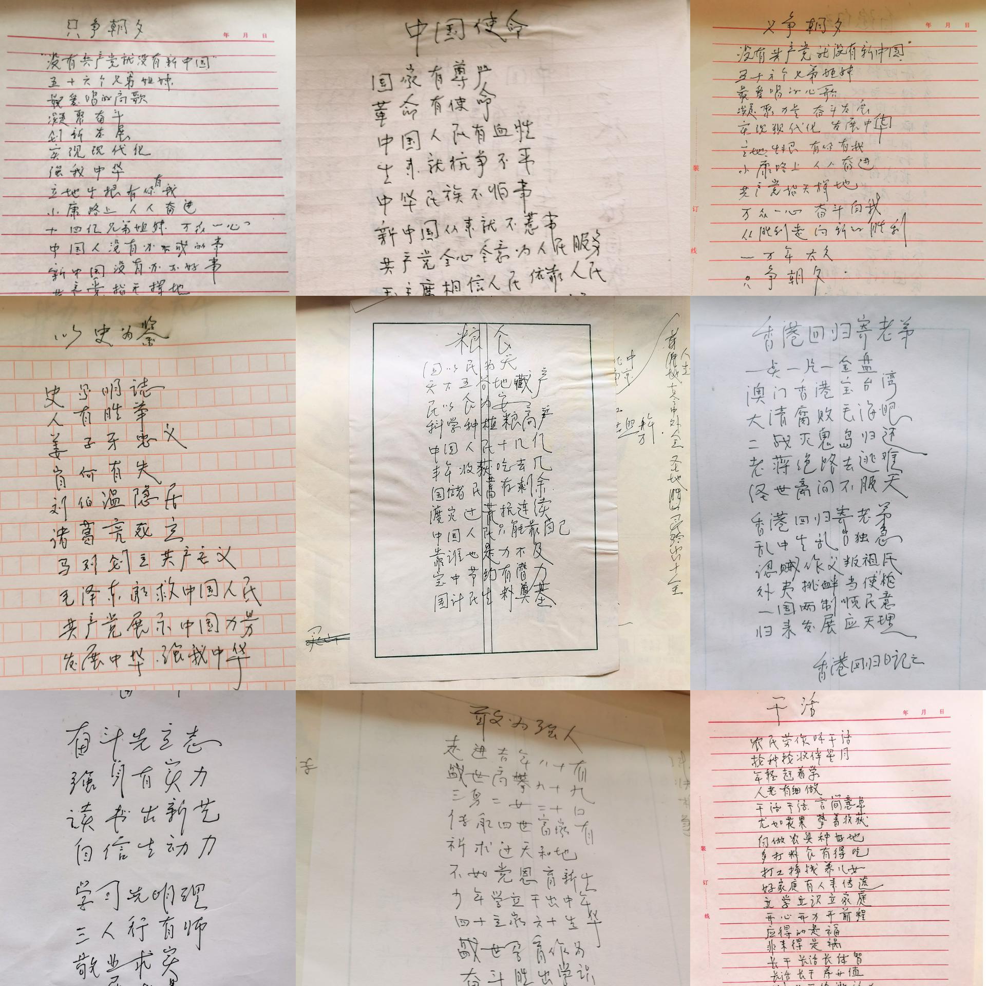 讲至兴奋处,张太金拿出了他珍藏多年的诗歌手写稿,书页已然泛黄,从1998到2021年,岁月磨去了纸张的颜色,却没有磨去他对祖国的赤诚。他一页一页地翻着自己的诗歌,并讲述着诗歌背后的故事。他的诗词中有“小我“的成长,“更有”大我“的作为;有小家的幸福,更有大国的荣光。从诗词中我们感受到这名退伍老兵对祖国深沉的爱意和对共产党最真挚的赞扬。