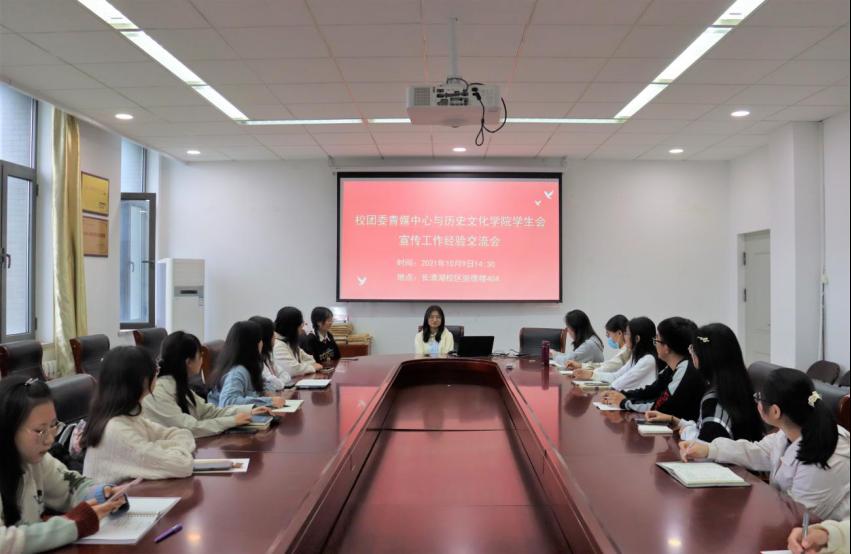 为提高学生干部撰稿能力,做好学院活动的宣传工作,10月9日下午,历史文化学院于长清湖校区崇德楼404会议室举办校团委青媒中心与历史文化学院学生会宣传工作经验交流会。交流会由学院2020级辅导员蒋艺主持,特邀学校团委青年媒体中心主席王潇涵、秘书处部长单一雅、稿件部部长尹佳宁分享经验,学院学生会及青年媒体中心宣传类部门有关学生干部积极参加。