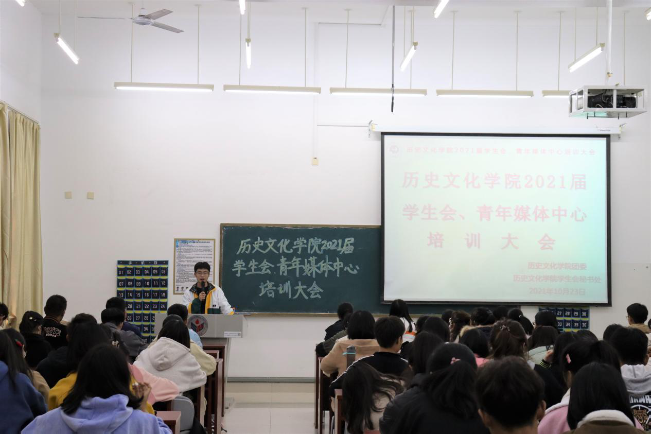 为使新成员进一步了解院学生会与青年媒体中心的工作模式和相关制度,严正纪律要求,尽快熟悉相关工作,10月23日下午,历史文化学院于长清湖校区崇德楼114教室举办2021届学生会、青年媒体中心培训大会。本次会议由秘书处杨邵群主持,学生会和青年媒体中心2021级全体成员参加了此次会议。