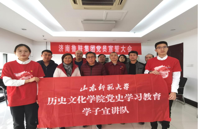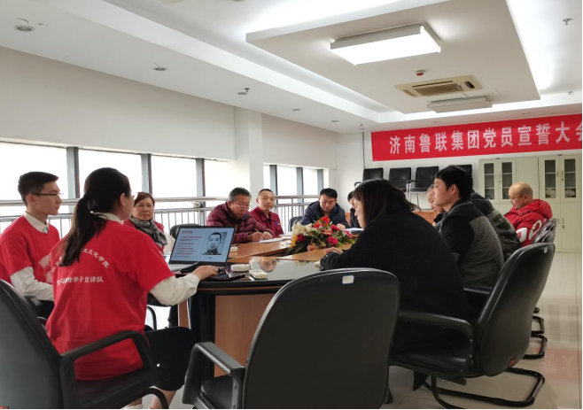 为庆祝建党100周年,在党史学习中砥砺初心使命,汲取奋进力量,11月26日下午,历史文化学院党史学习教育学子宣讲队赴鲁联公司开展党史宣讲。学子宣讲队成员耿宇进行了以“济南战役”为主题的党史宣讲,鲁联公司党支部书记丛培政、党支部副书记朱军、总经理李萍、党支部党员同志、学子宣讲队部分成员共20余人参与了本次宣讲活动。