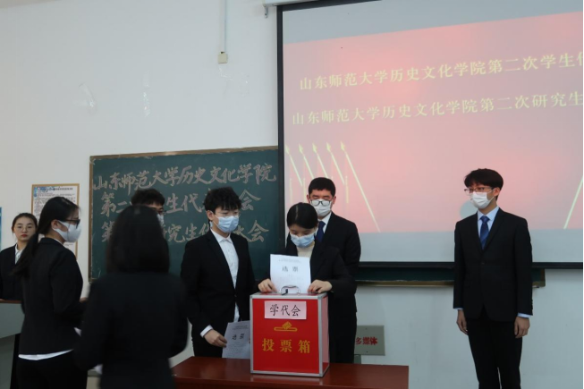 学院学生会主席向锦国、学院研究生会主席赵浩涵分别向大会作了学生会工作报告和研究生会工作报告。与会代表听取了《学代会资格审查报告》《研代会资格审查报告》,审议通过了、学代会、研代会各项议程。表决通过了大会选举办法及大会监票人、计票人名单,审议并通过了《山东师范大学历史文化学院学生会工作报告的决议》《山东师范大学历史文化学院研究生会工作报告的决议》,通过了山东师范大学历史文化学院第2022届学生会主席团、学生委员会候选人名单和2022届研究生会主席团、研究生会委员会候选人名单,最后与会代表通过无记名投票的方式选举产生了新一届学生会、研究生会委员及主席团。